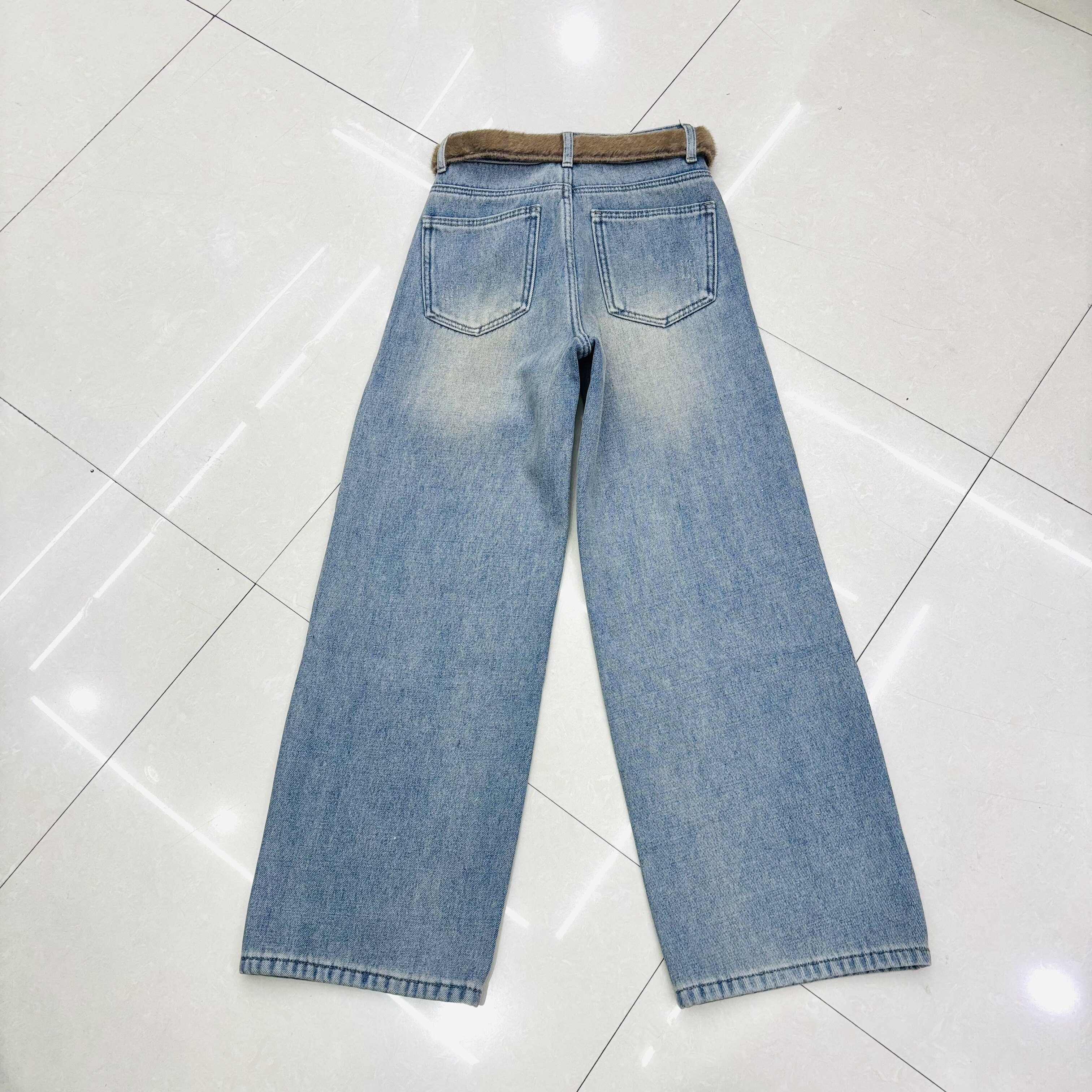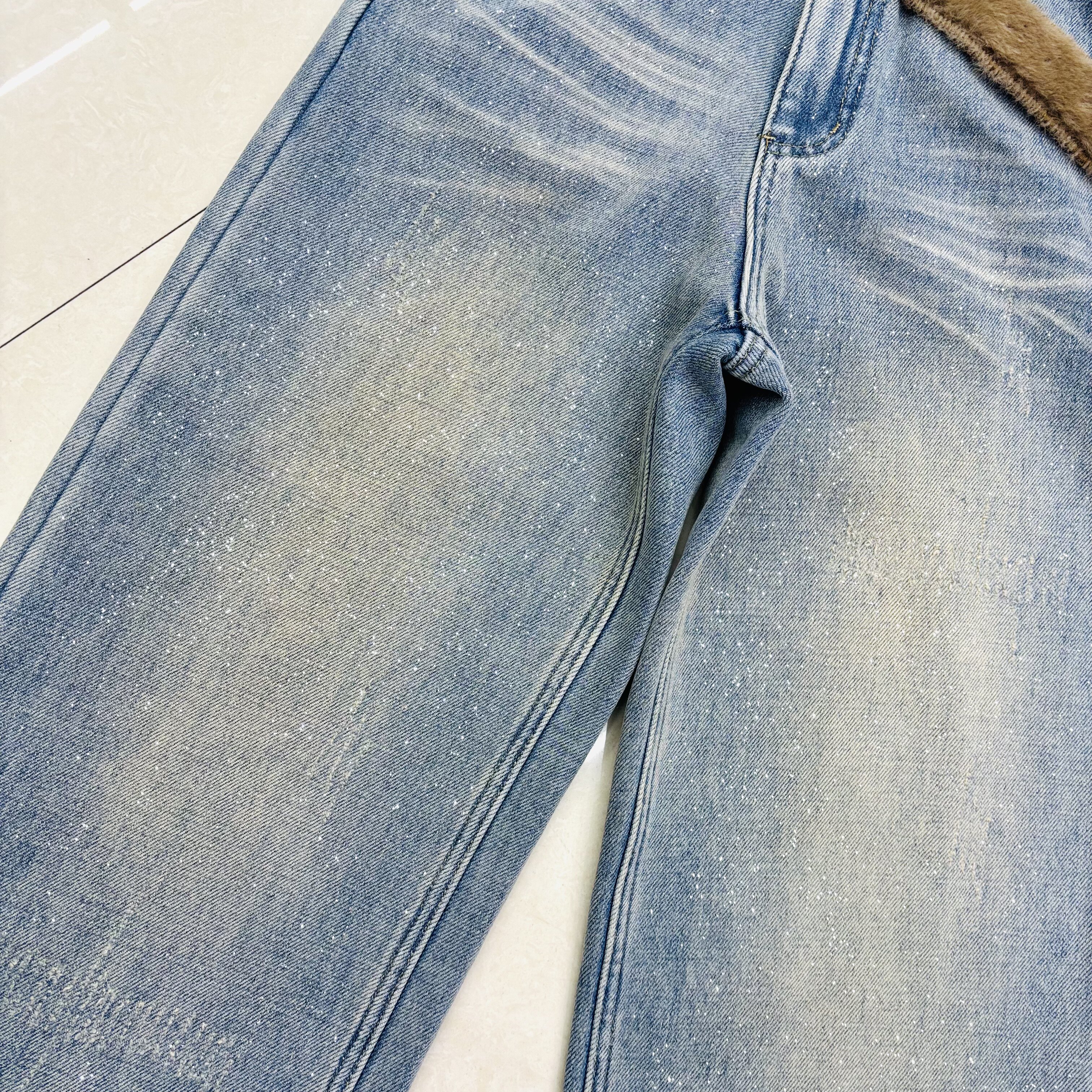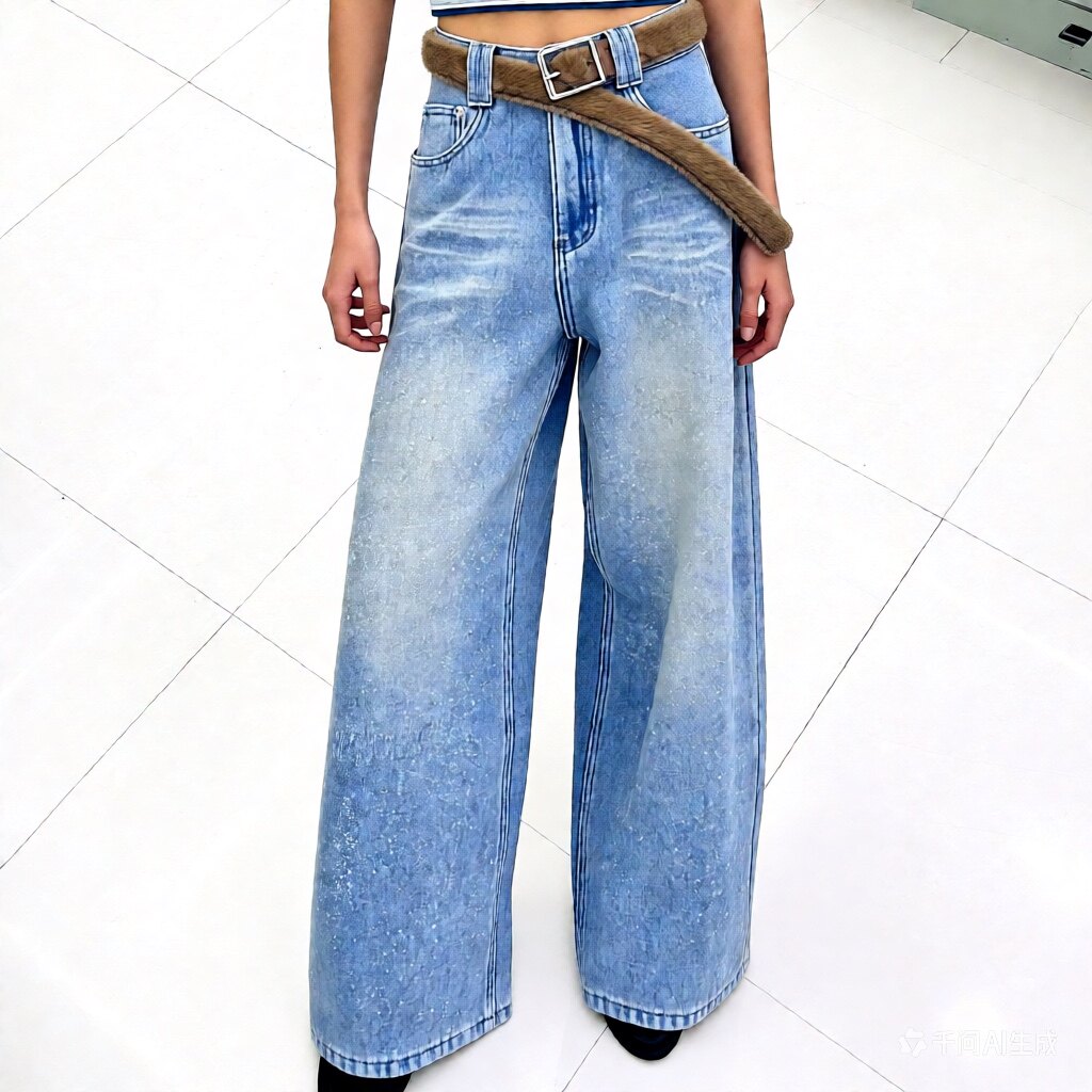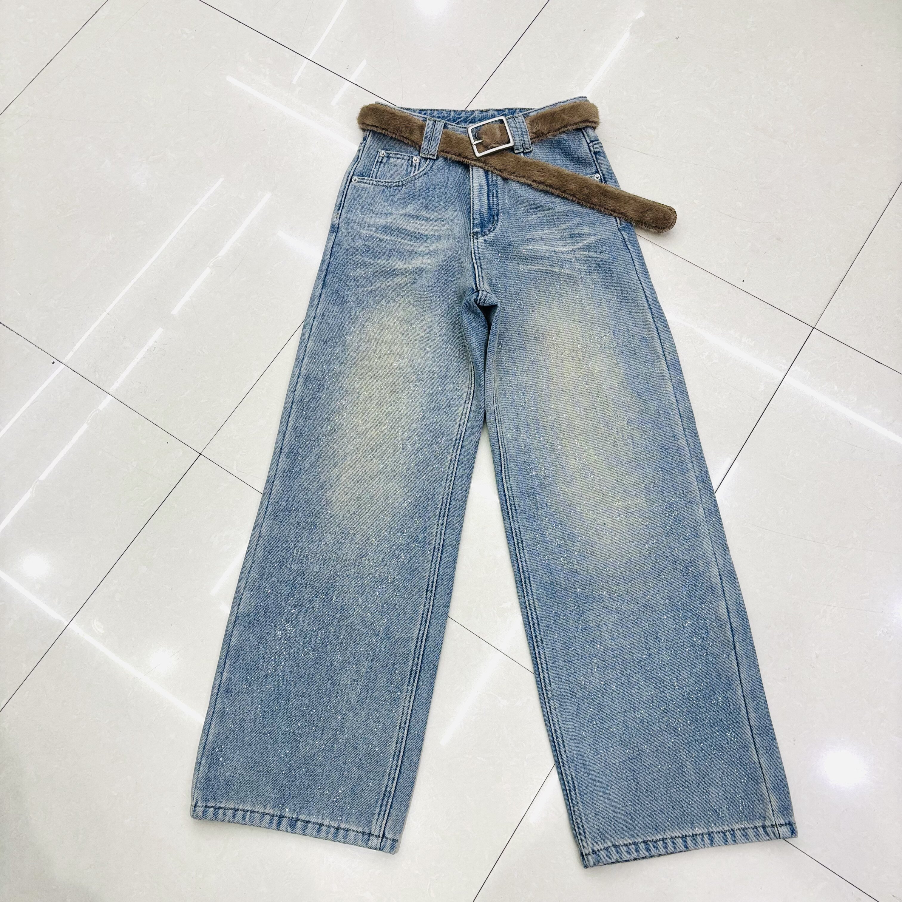 📚 加绒加厚亮片浅蓝色水洗折痕阔腿牛仔裤女高腰宽松直筒拖地5482