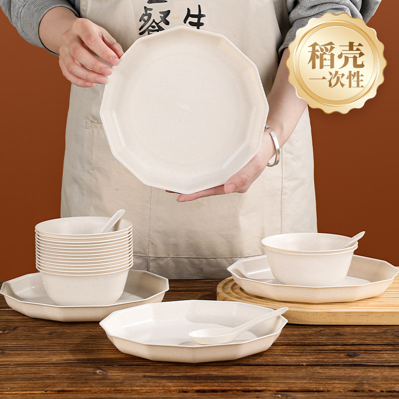 📚 稻壳餐具三件套装一次性饭碗筷杯碟子家用食品级耐高温用餐四件套