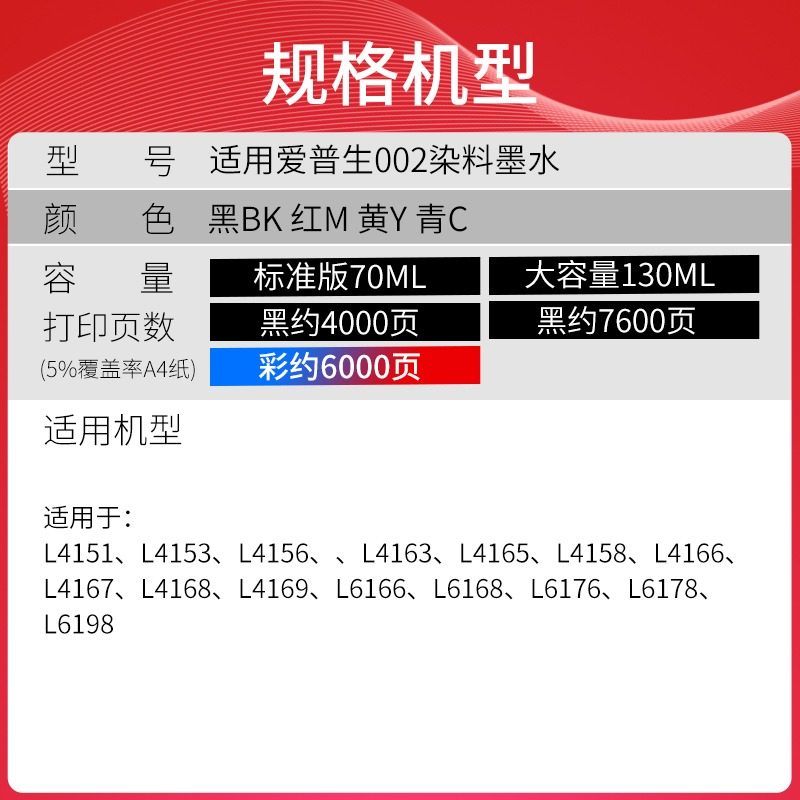 📚 天威适用爱普生002墨水L4158 L4166 L4168 L4266 L4268 L6279 L6298 L6166 L6168 L6176 6178 6198打印机墨汁