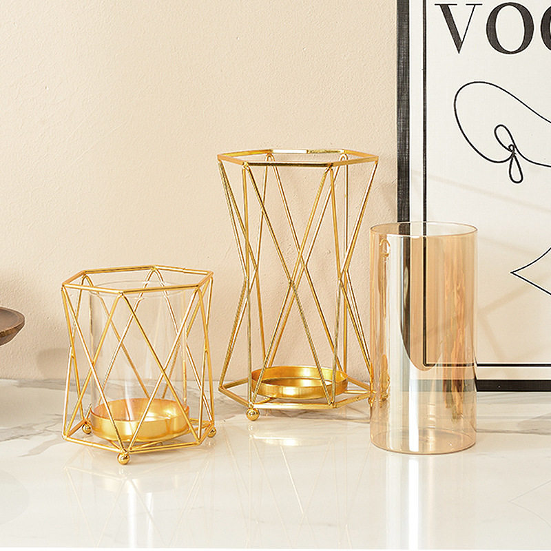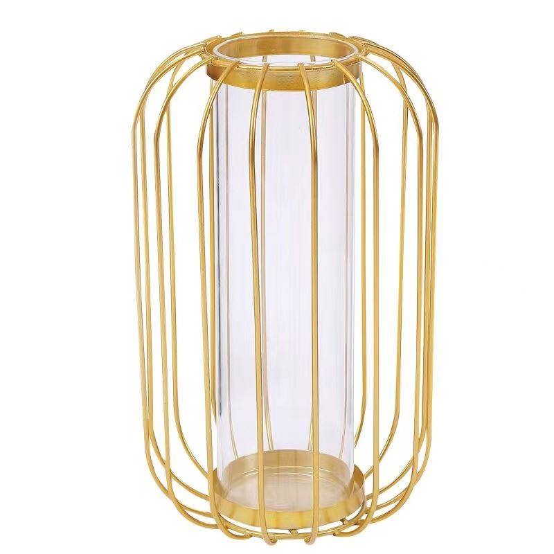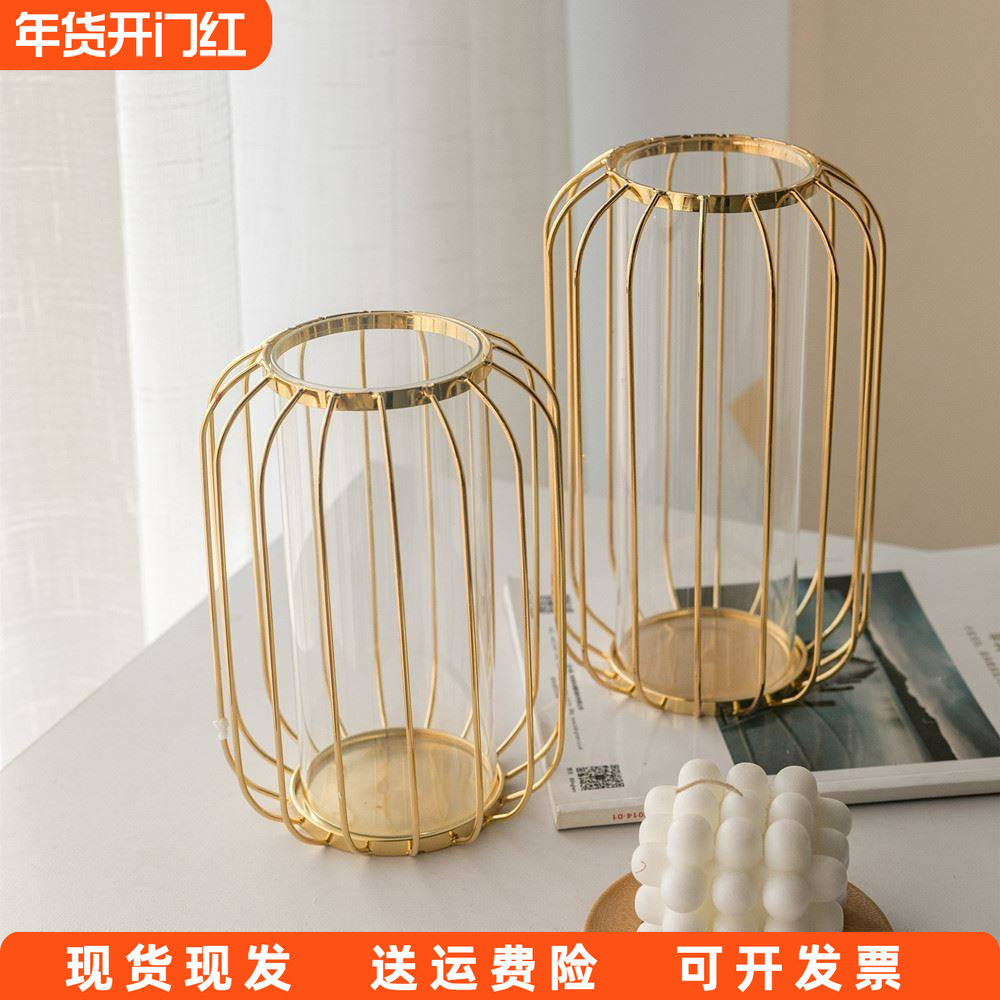📚 灯笼玻璃花瓶高级感轻奢金属玻璃花瓶客厅玄关餐桌样板房装饰摆件