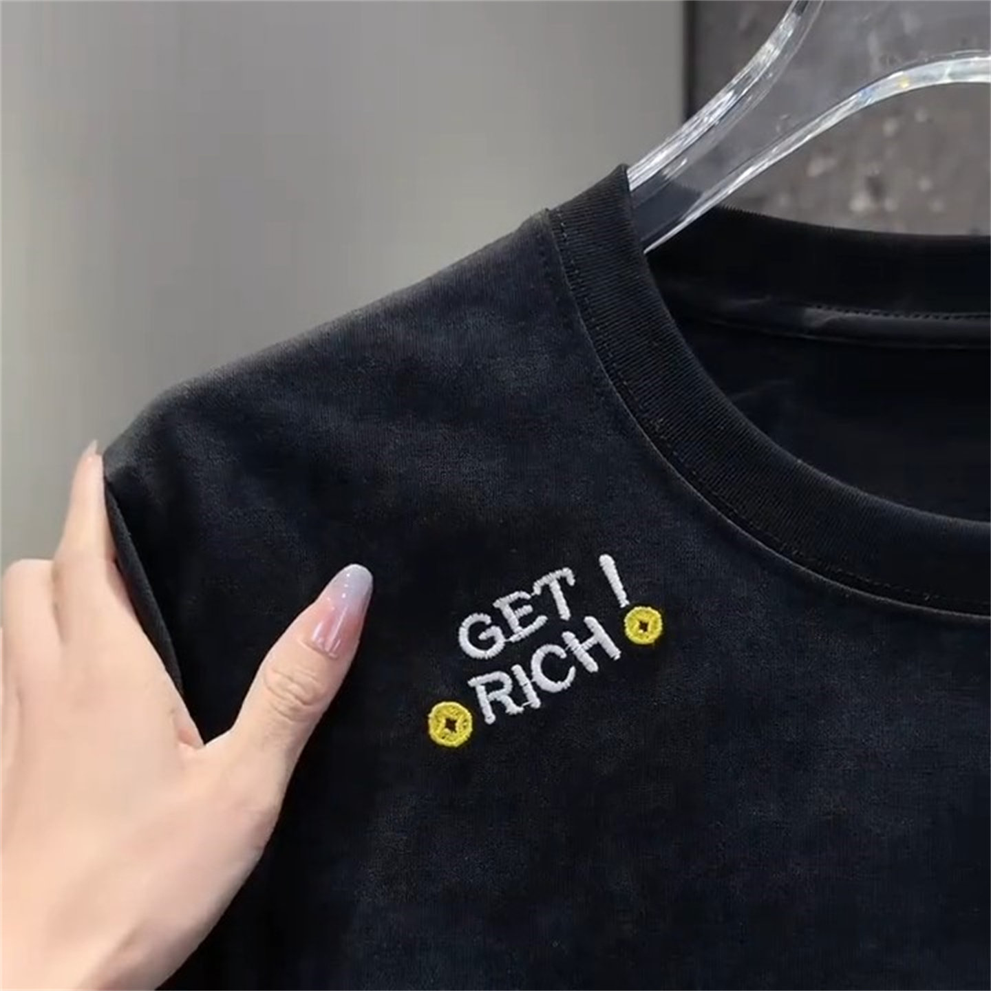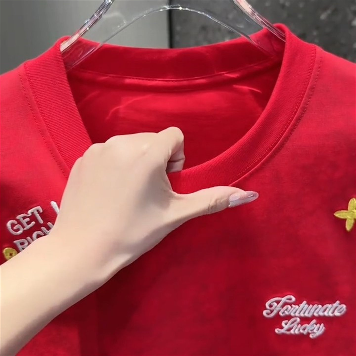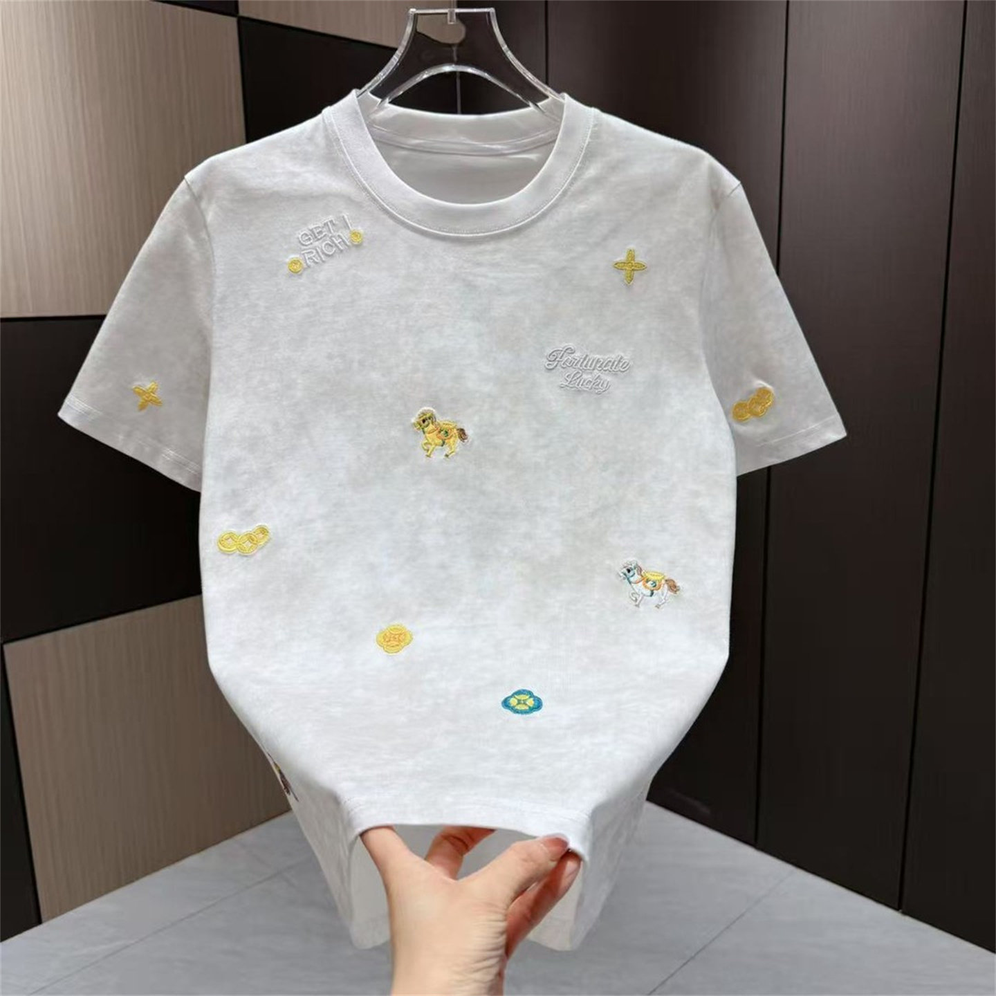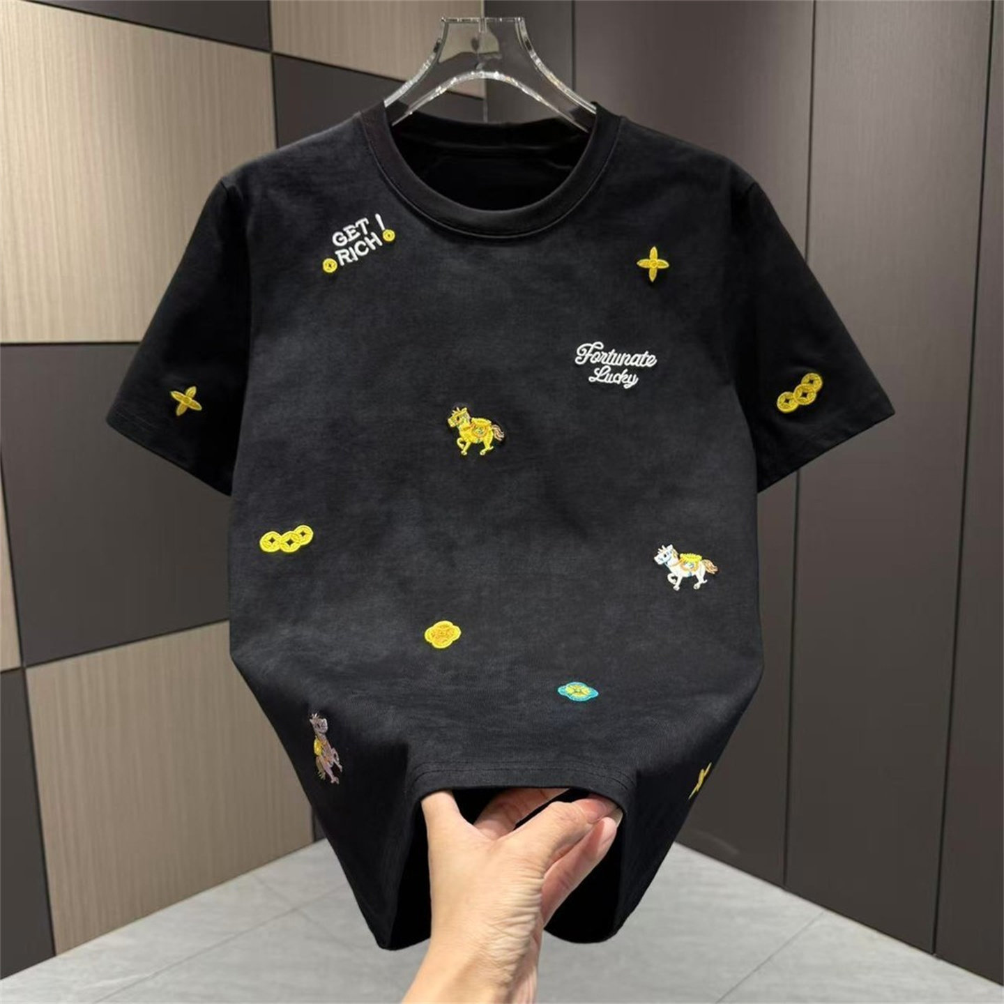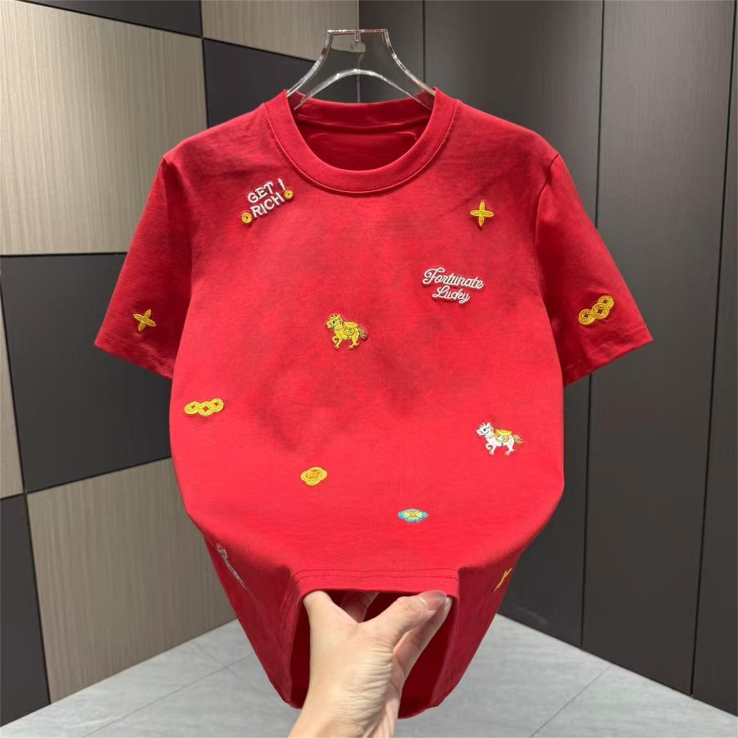 📚 潮流刺绣马年晕染短袖T恤男红色圆领个性趣味图案夏季时尚上衣男