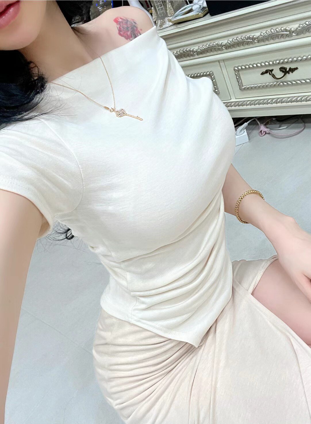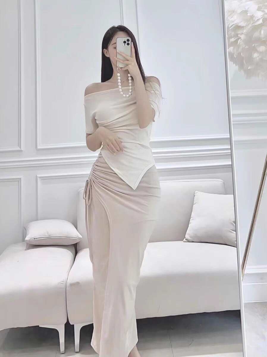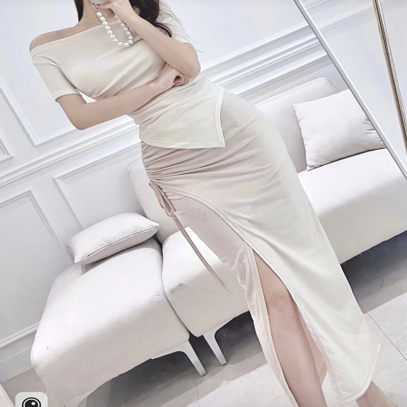 📚 韩东大门时尚舒适潮流新款不规则褶皱露肩一字领短袖T恤半裙女装