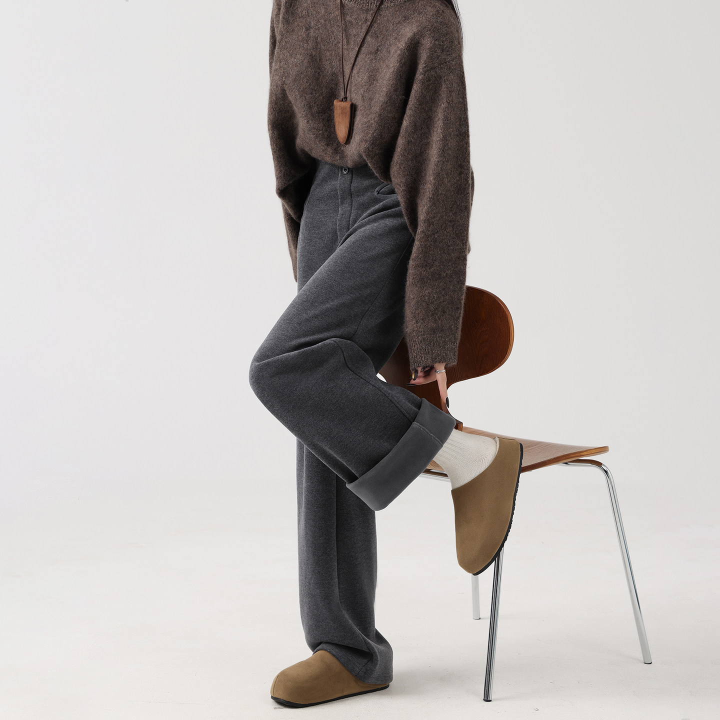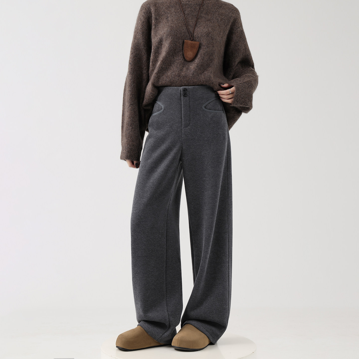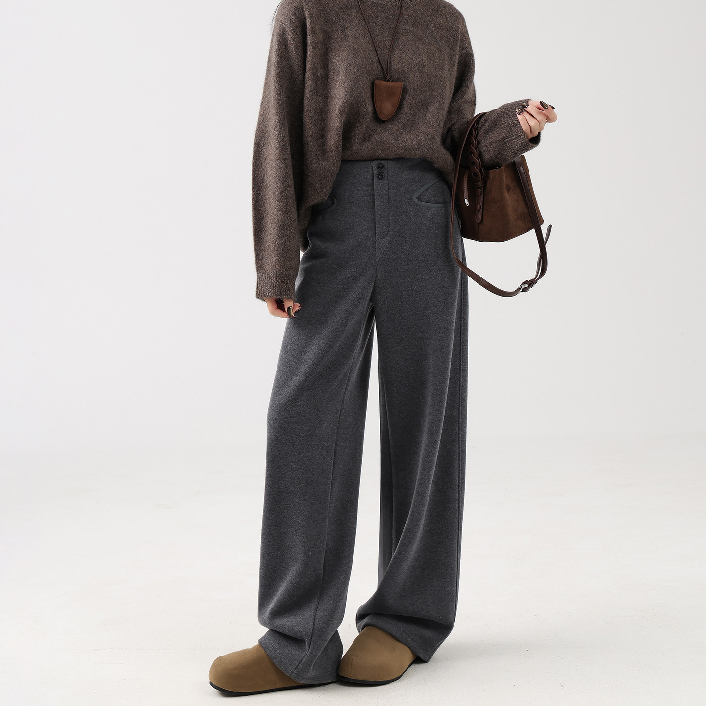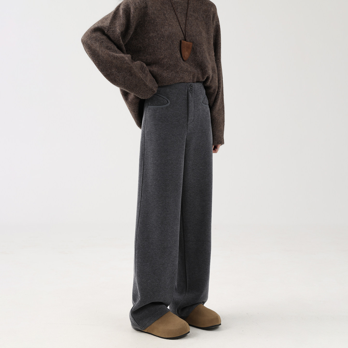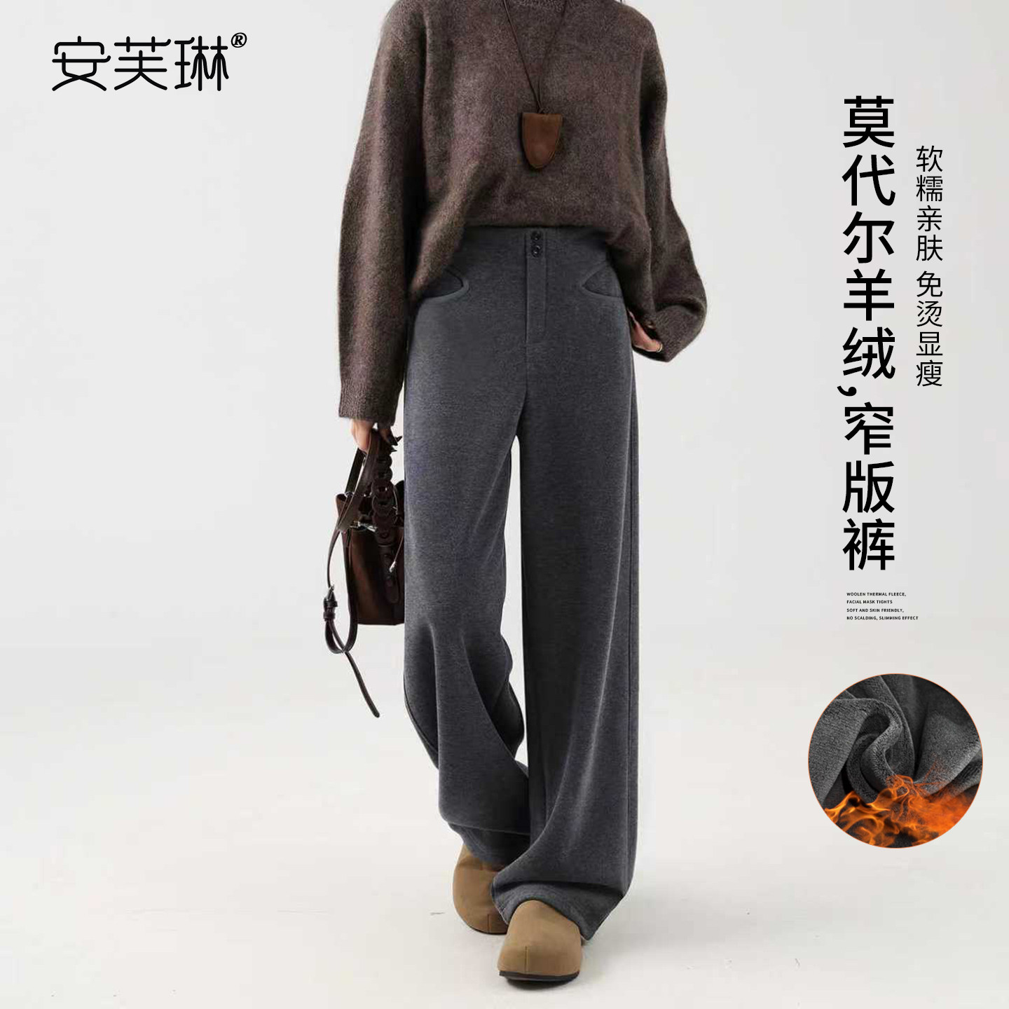 📚 安芙琳【莫代尔羊绒】灰色窄版阔腿裤女秋冬加绒加厚高腰直筒裤