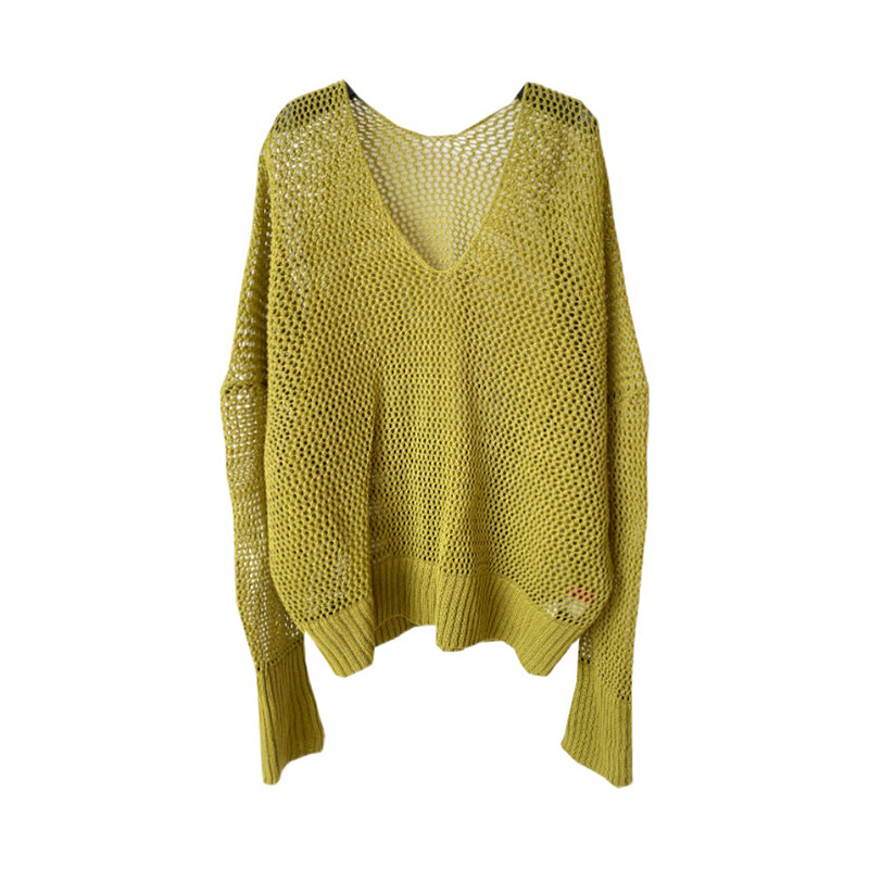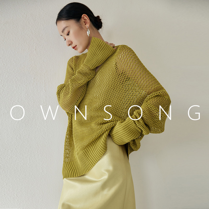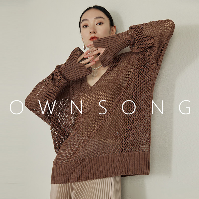 📚 OWNSONG手工钩花!清透感镂空纯棉V领中长宽松纸片人针织罩衫女秋