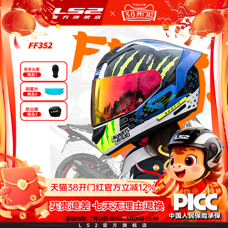 📚 LS2全盔男女摩托车骑士情侣机车头盔四季防雾大尾翼通用FF352