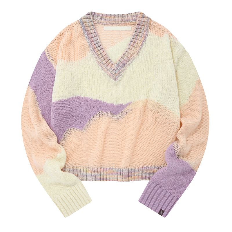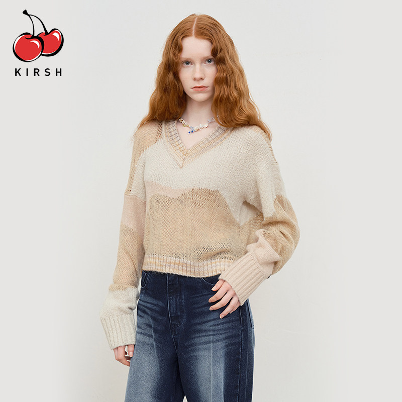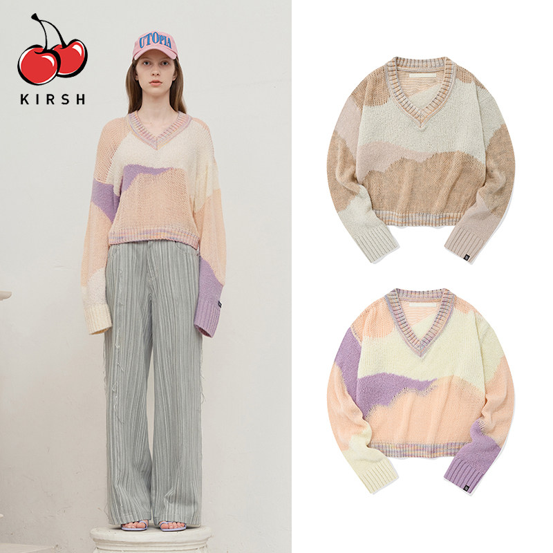 📚 kirsh大樱桃春夏新款套头针织衫V领宽松抽象拼色甜美洋气韩版毛衣