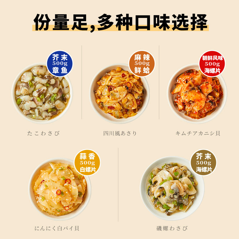 📚 洋琪食品上海麻辣鲜蛤芥末章鱼500g花甲海鲜罐头日料店小菜海螺片