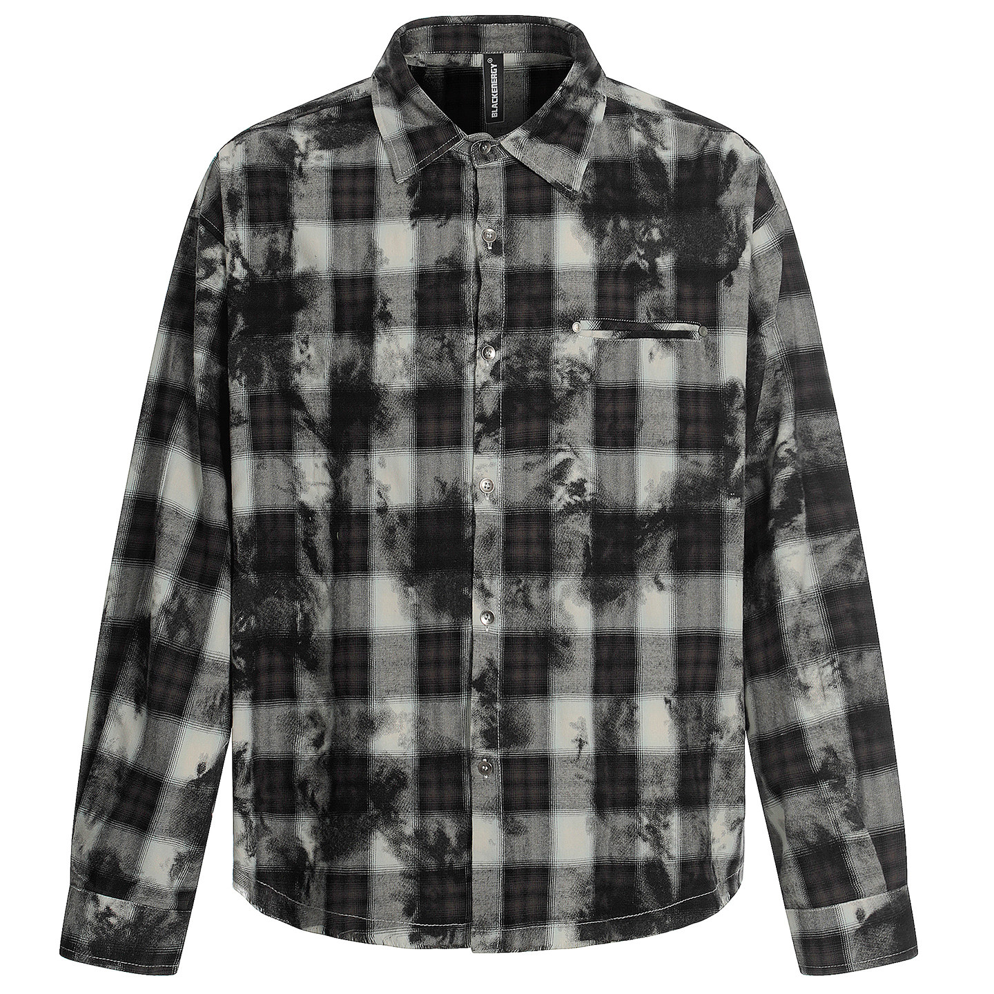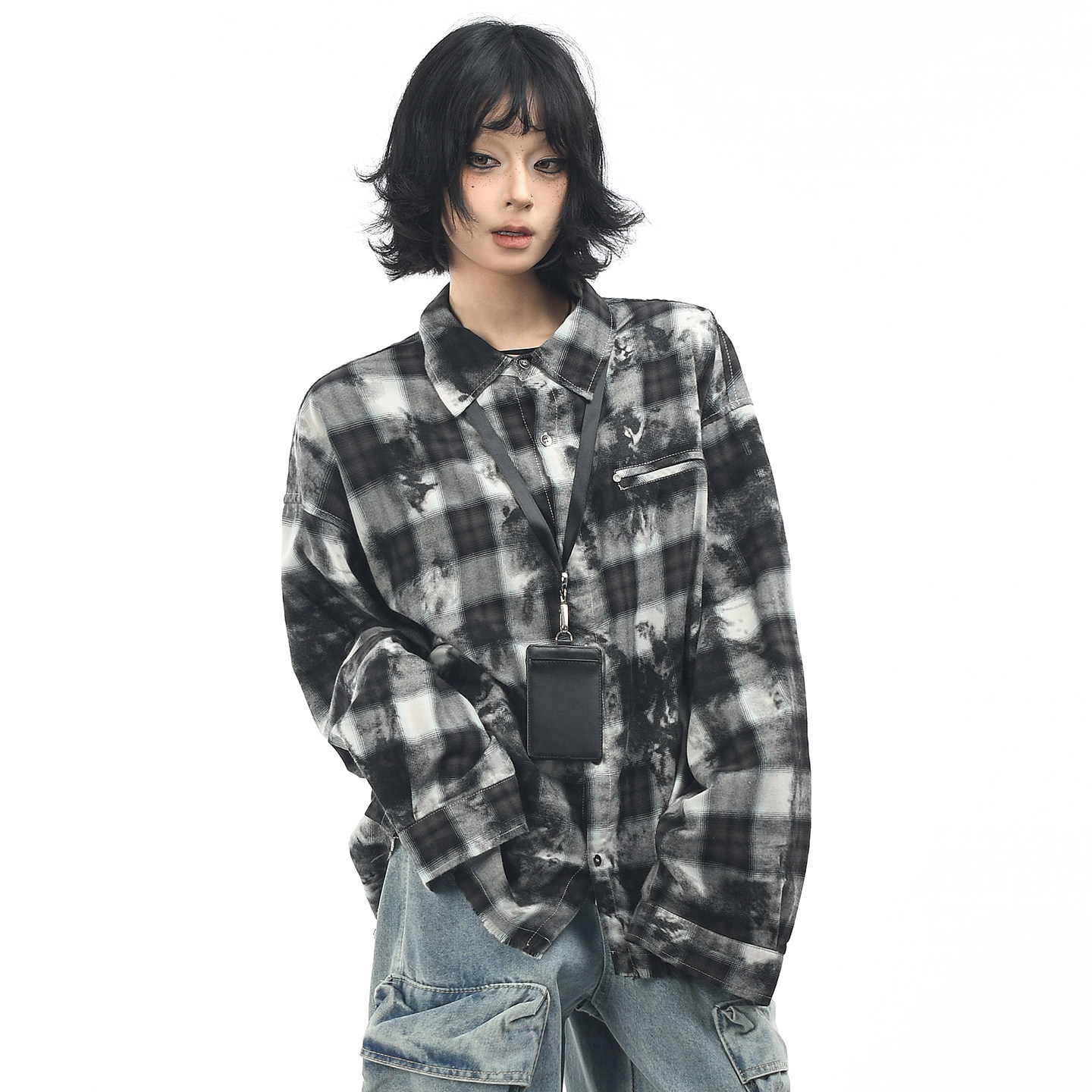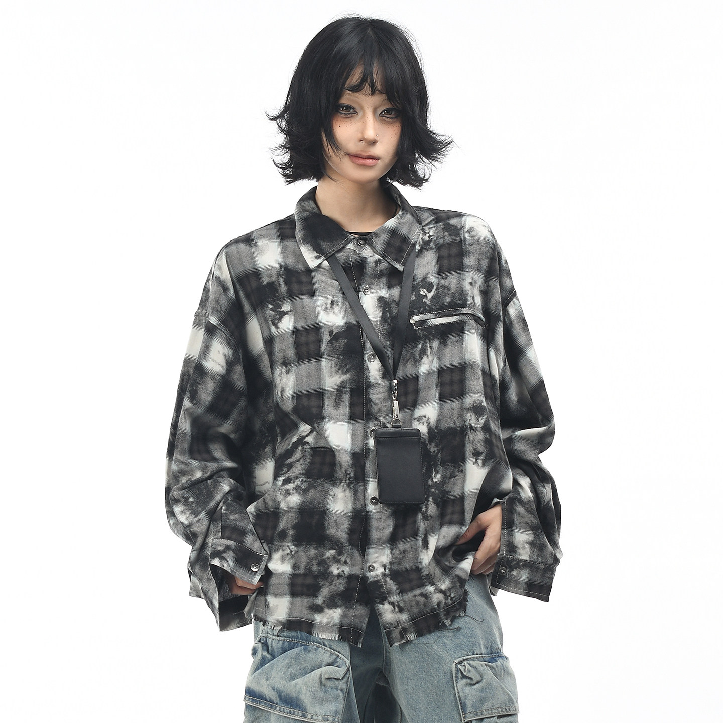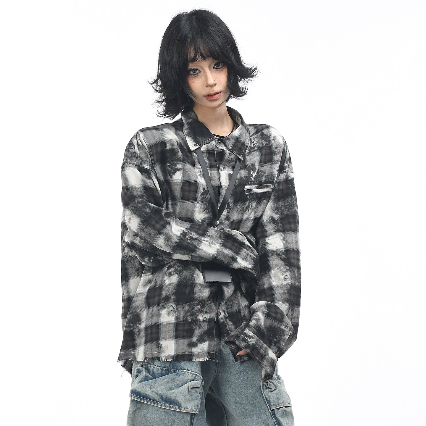 📚 OV原创美式复古格子扎染做旧长袖衬衫男女秋季宽松休闲毛边衬衣潮