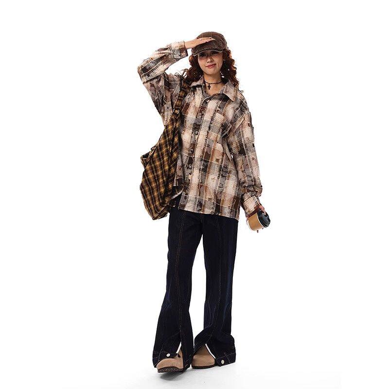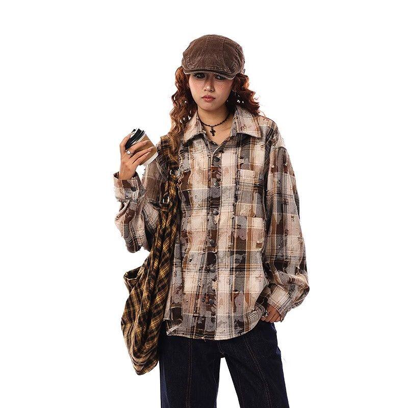 📚 美式复古街头扎染格子衬衫男女春秋款磨毛破洞设计情侣长袖上衣外