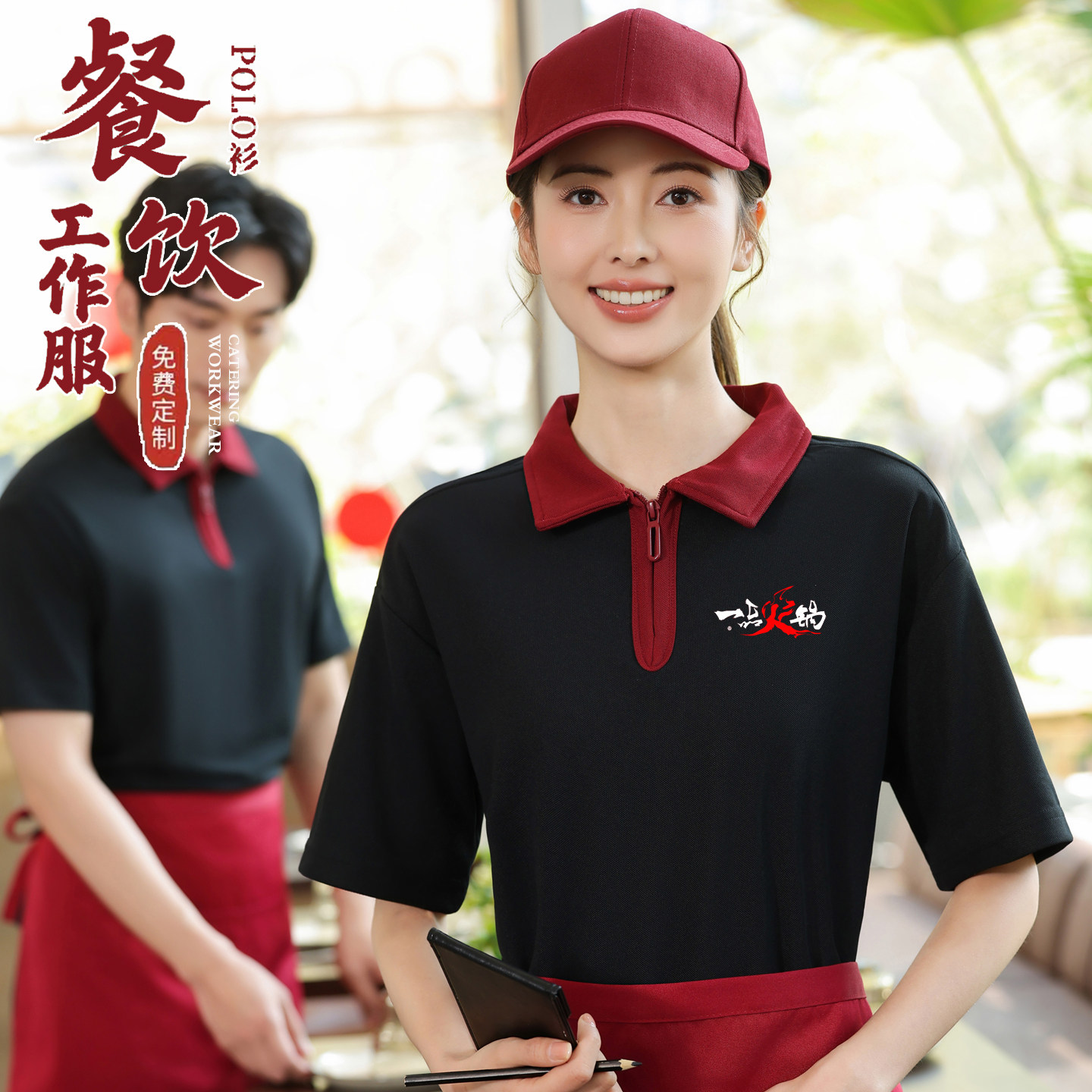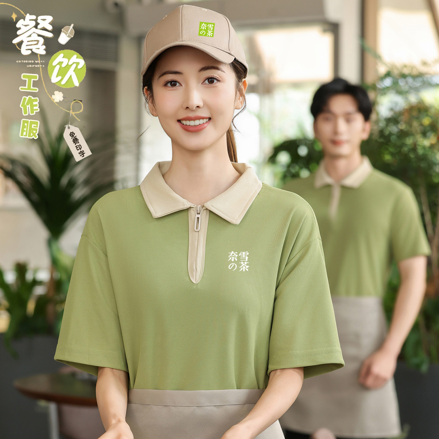 📚 半拉链餐饮工作服t恤定制logo咖啡奶茶店服务员工装短袖polo衫夏
