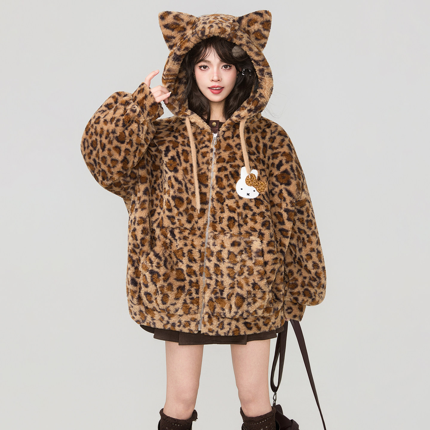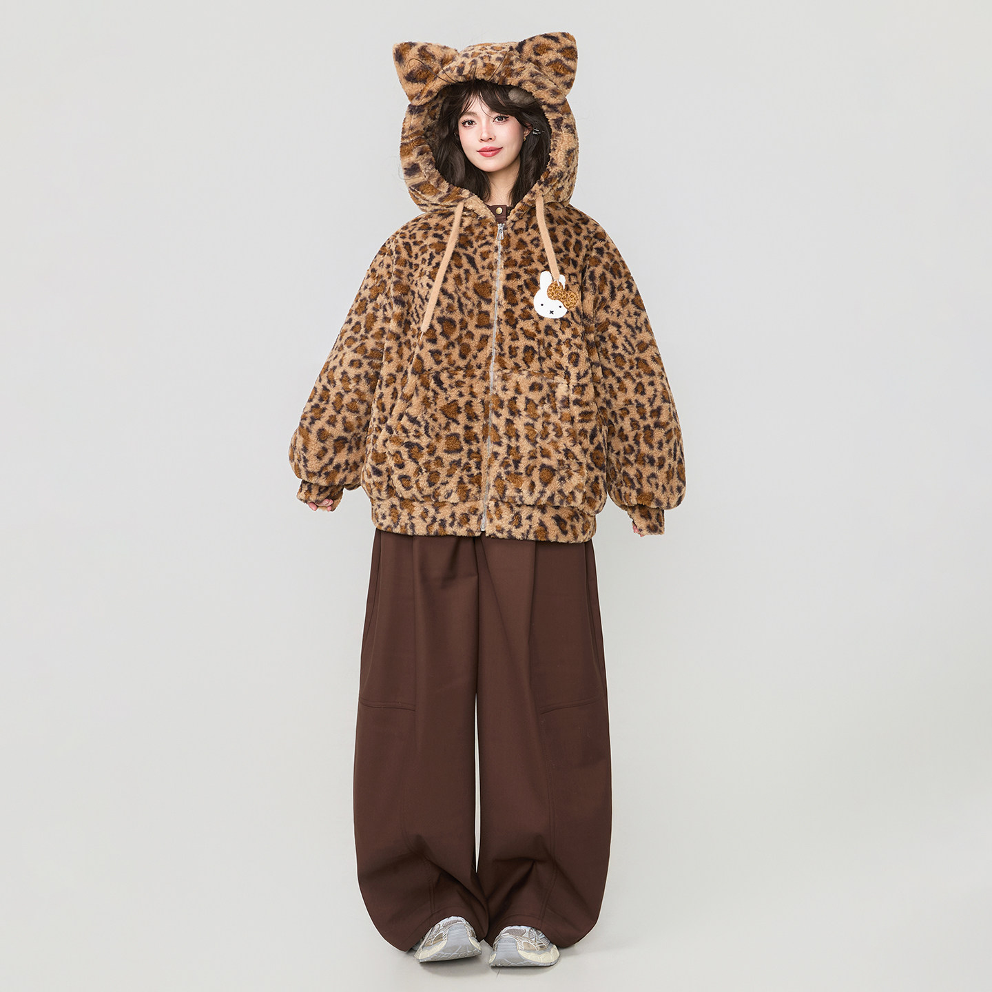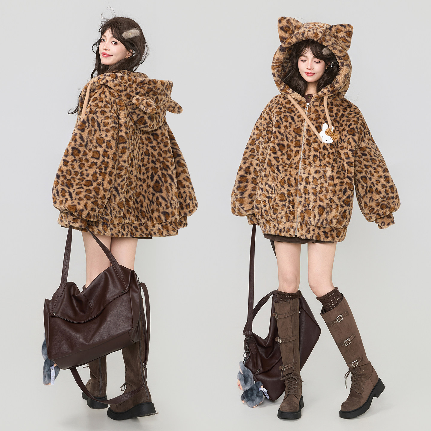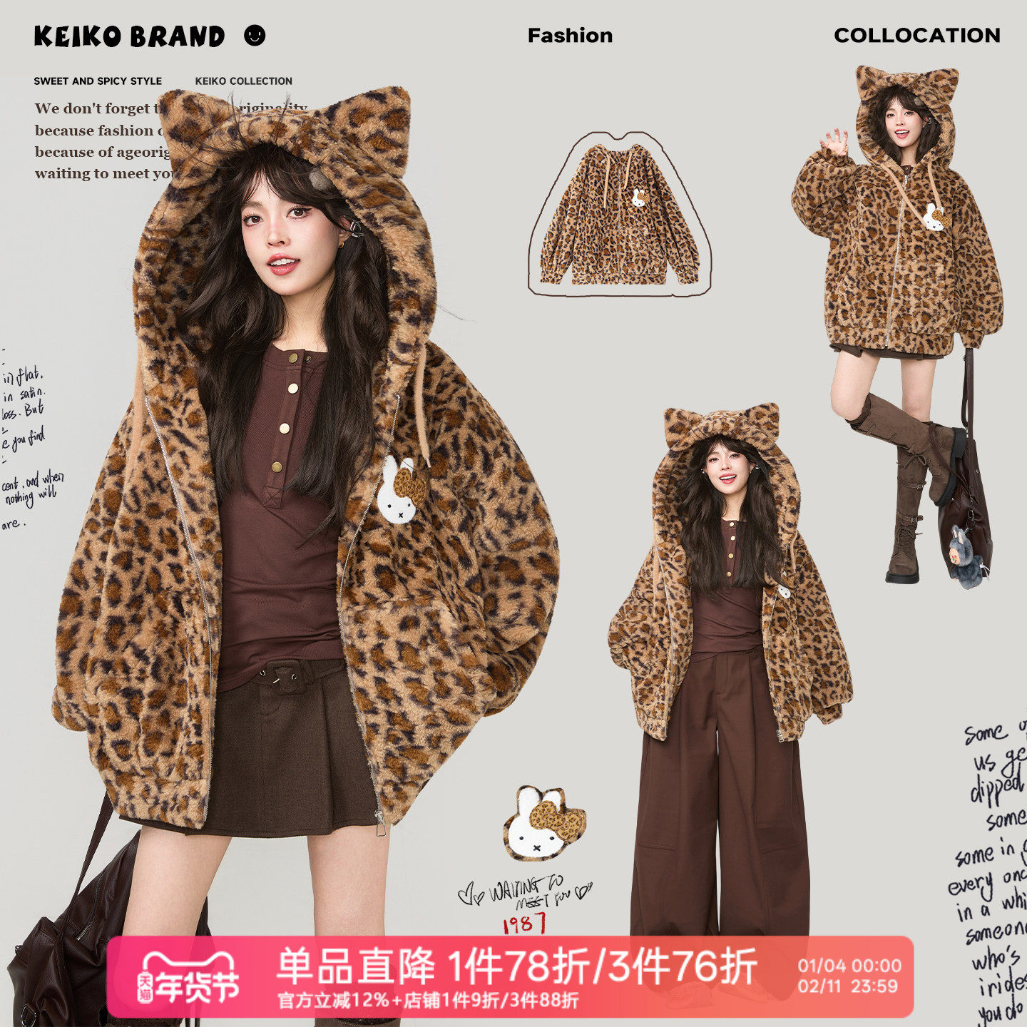 📚 KEIKO 复古豹纹连帽羊羔毛绒外套女2025冬季慵懒风夹棉加厚棉服