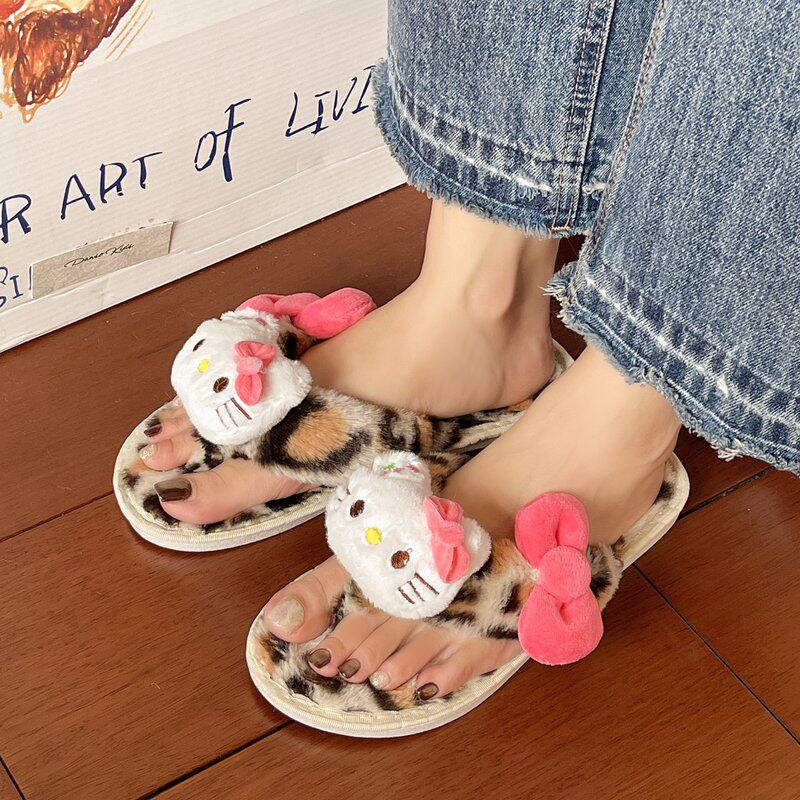 📚 甜拽可爱豹纹凯蒂猫夹板毛绒绒拖鞋女秋冬居家时尚软底防滑毛毛拖