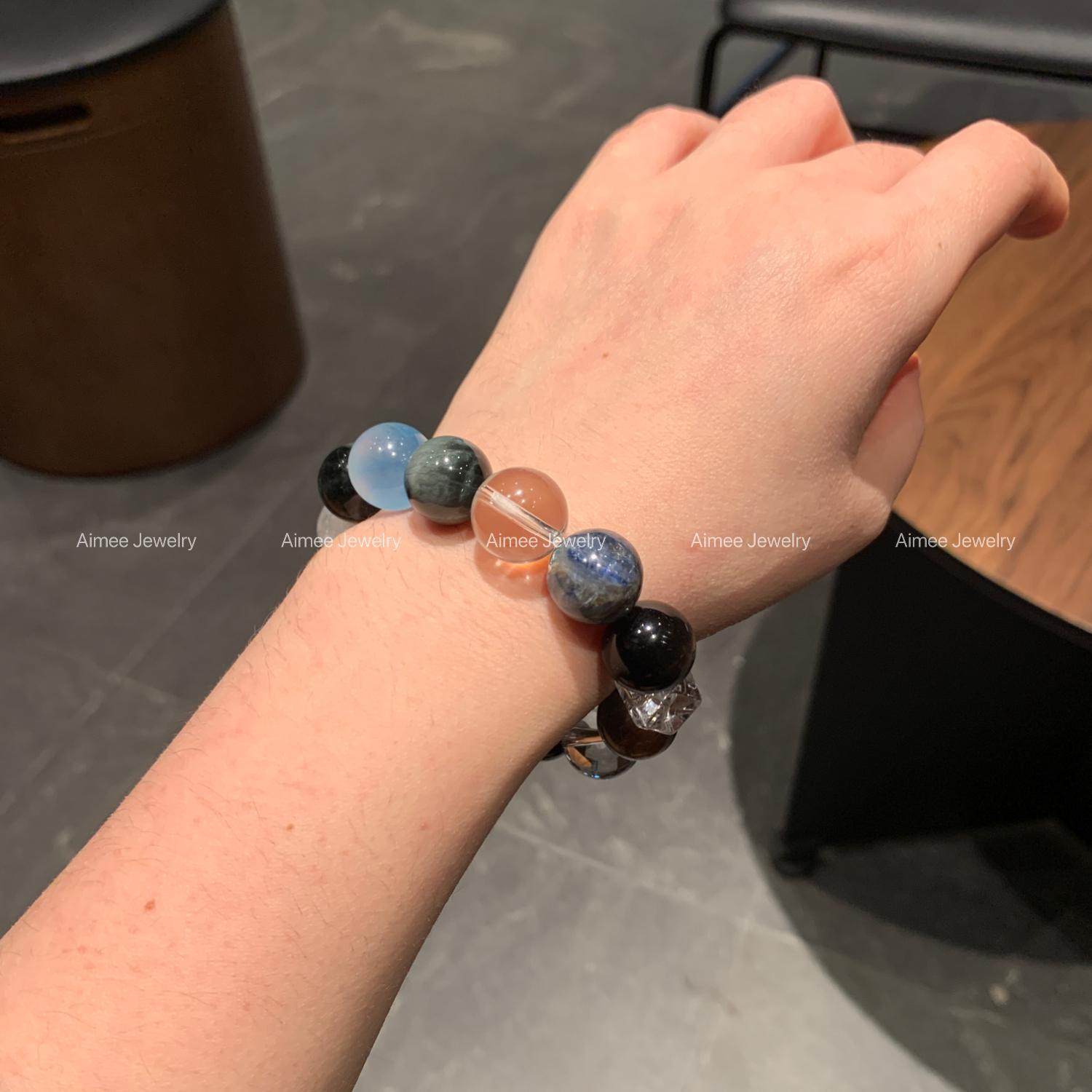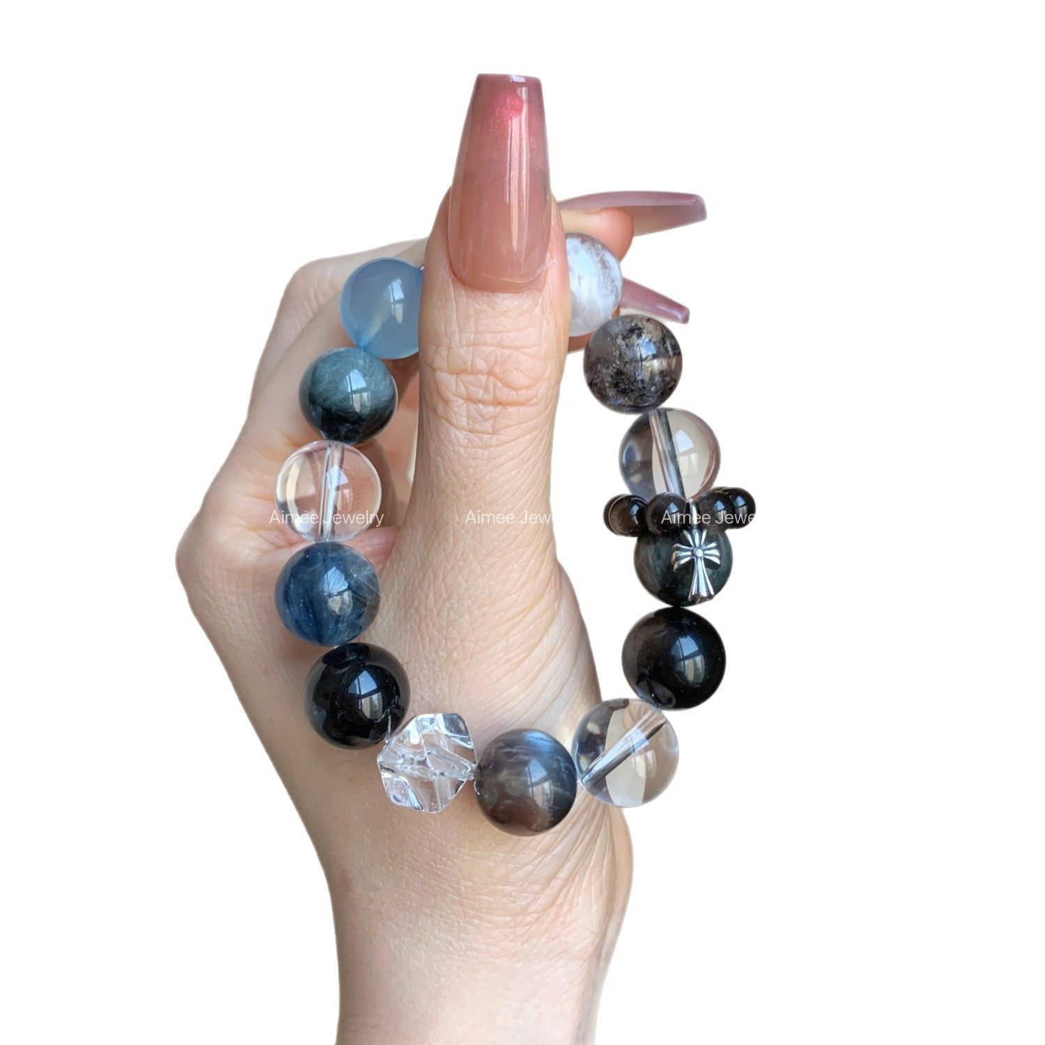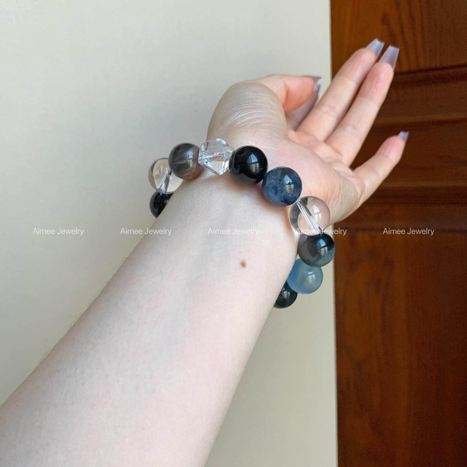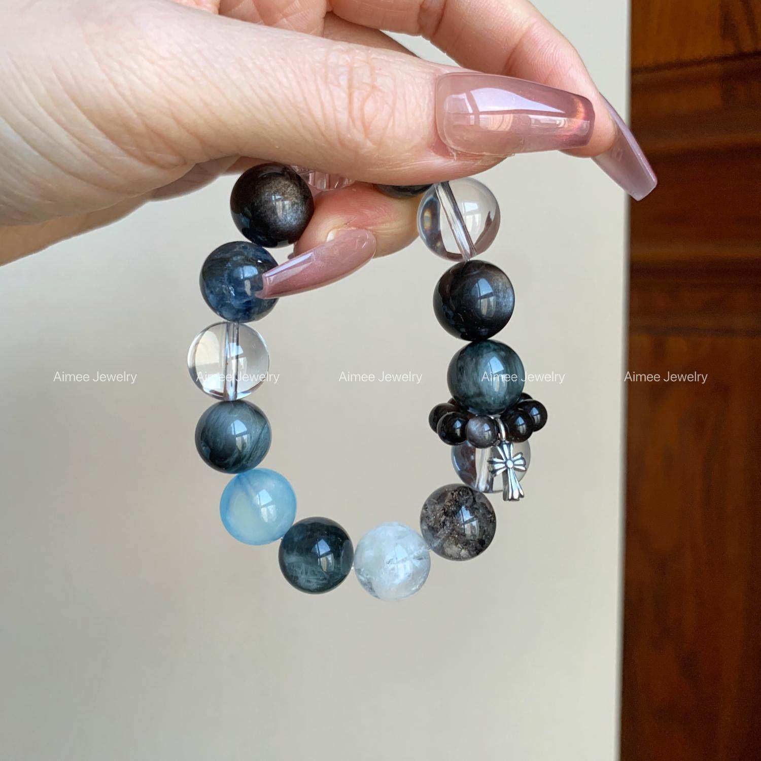 📚 天然海蓝宝水晶手串舒缓情绪压力银曜石白水晶手链水系男女款礼物
