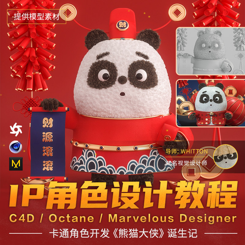📚 C4D IP设计教程角色设计与开发熊猫大侠建模绑定毛发场景制作流程