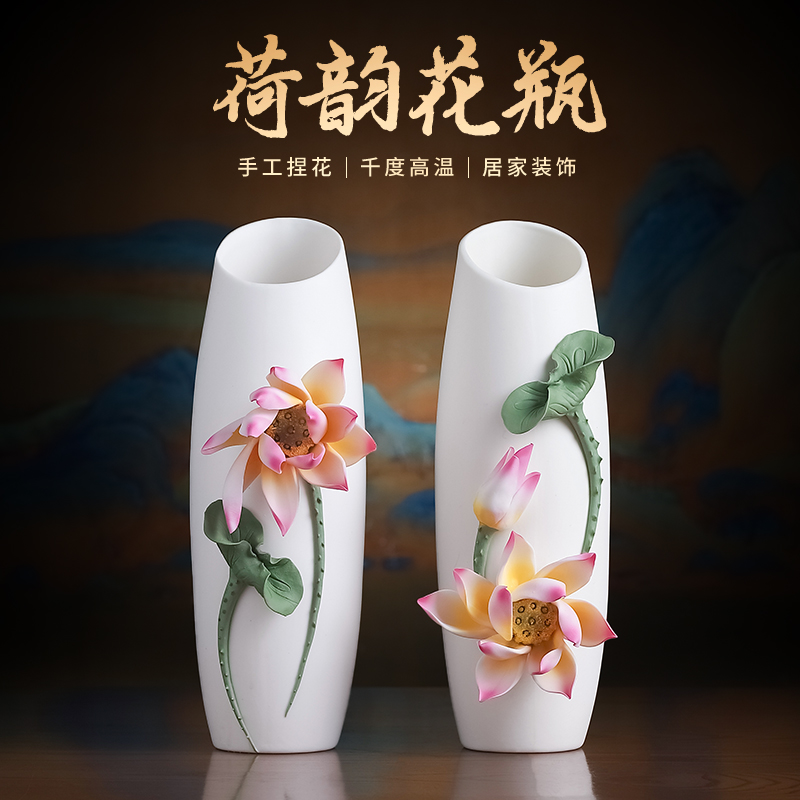 📚 陶瓷荷花一对花瓶莲花装饰品摆件客厅轻奢高档插花新中式佛堂佛前