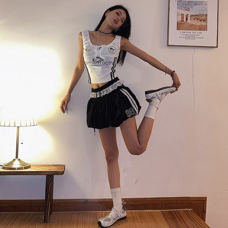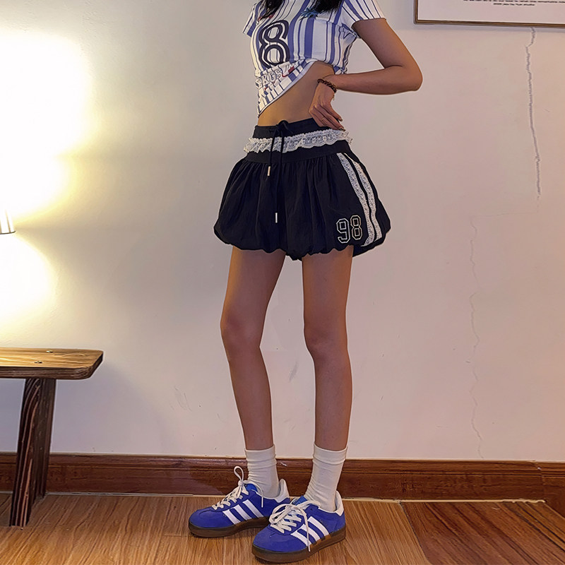 📚 Double美式辣妹芭蕾运动风蕾丝拼接刺绣字母花苞短裤女显瘦半身裙