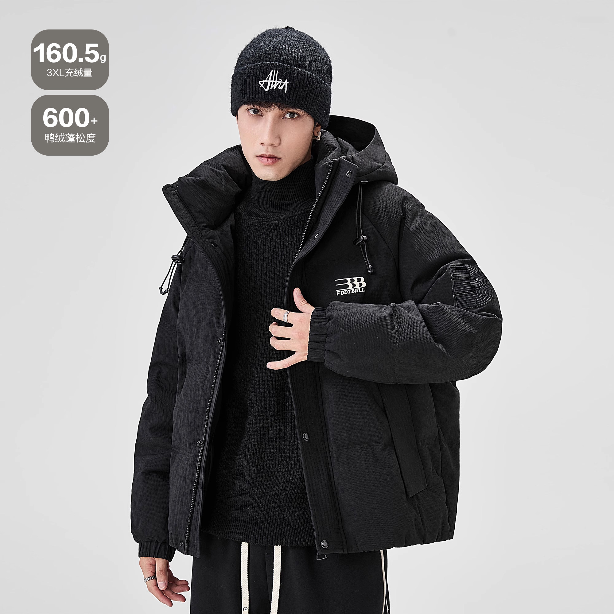 📚 ALLIN 黑色连帽羽绒服男款冬季字母印花美式潮牌加厚保暖情侣外套