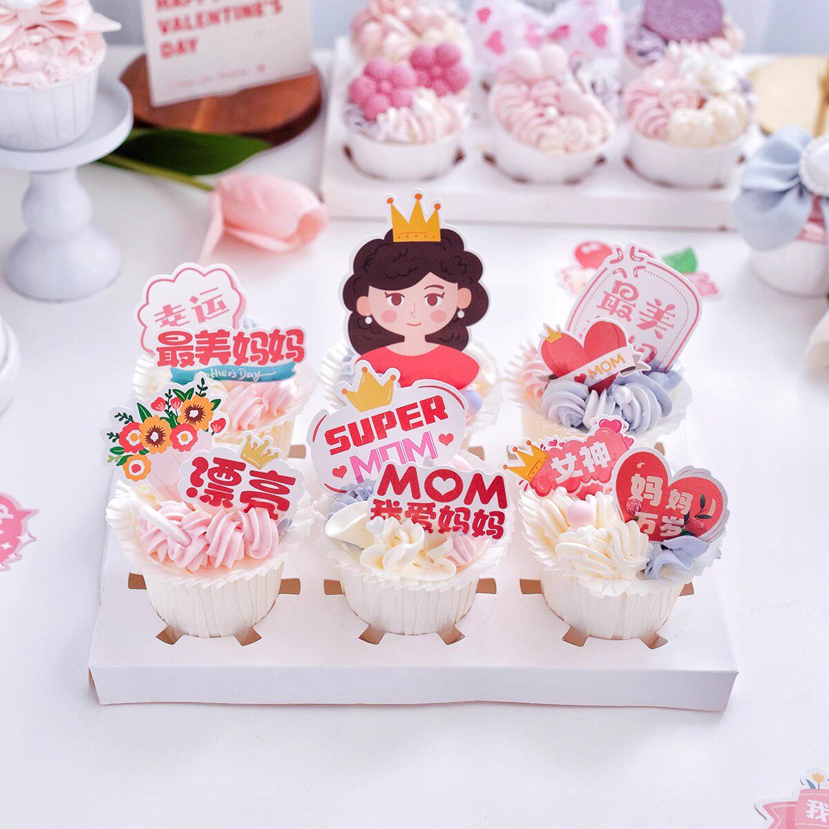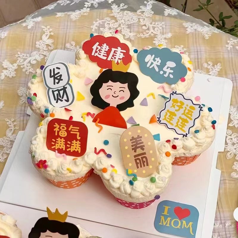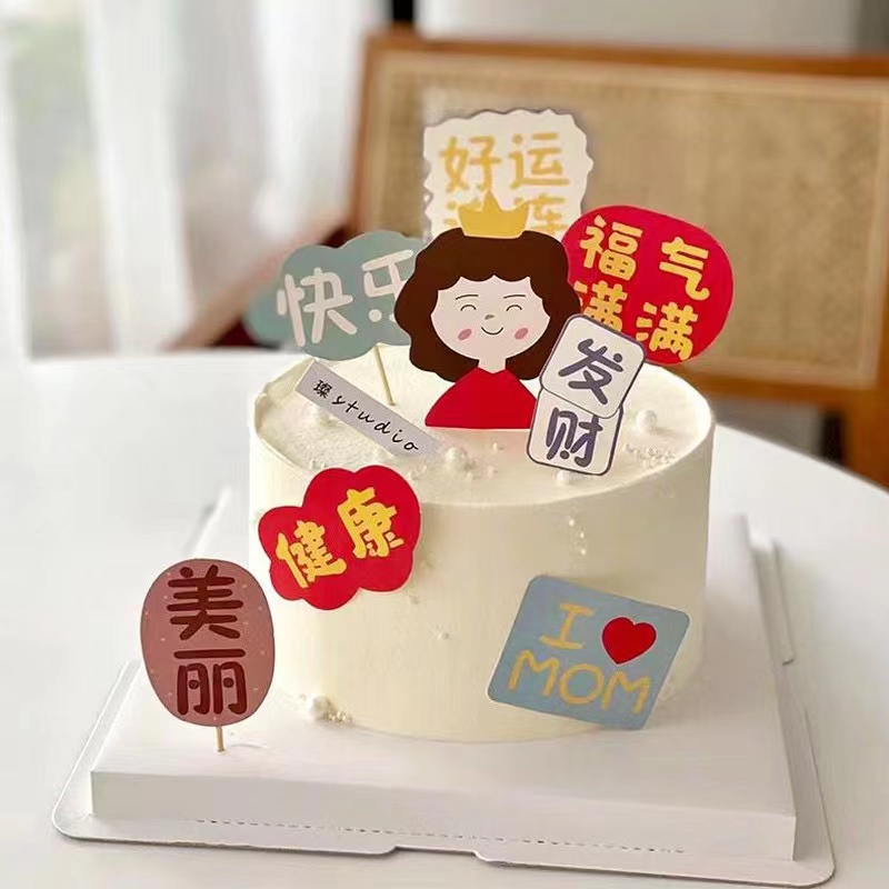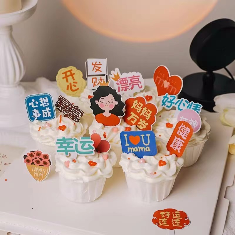 📚 母亲节蛋糕装饰插牌妈妈福气满满健康快乐祝福语生日纸杯插件插卡