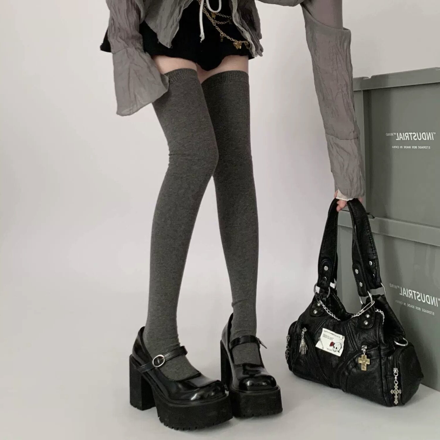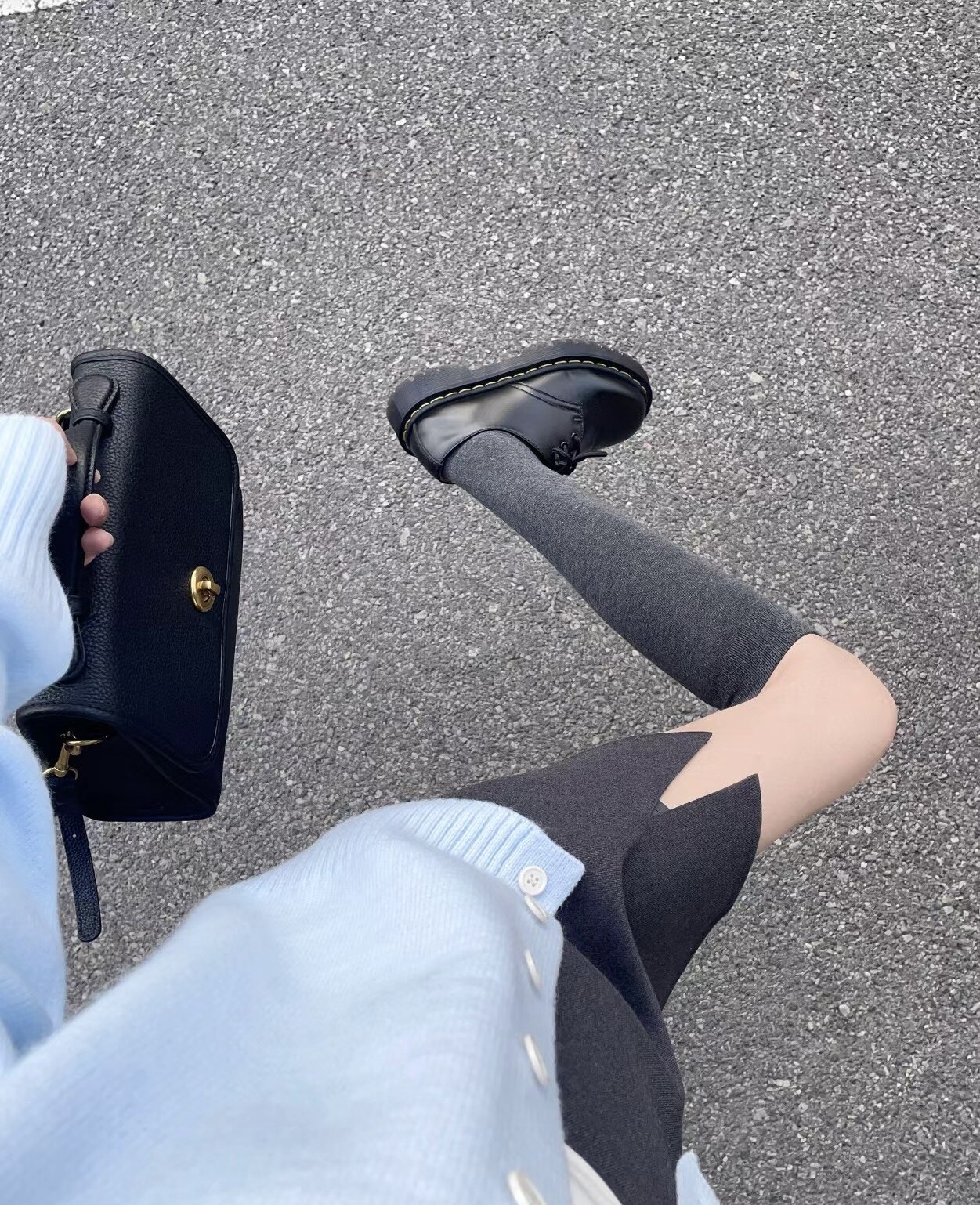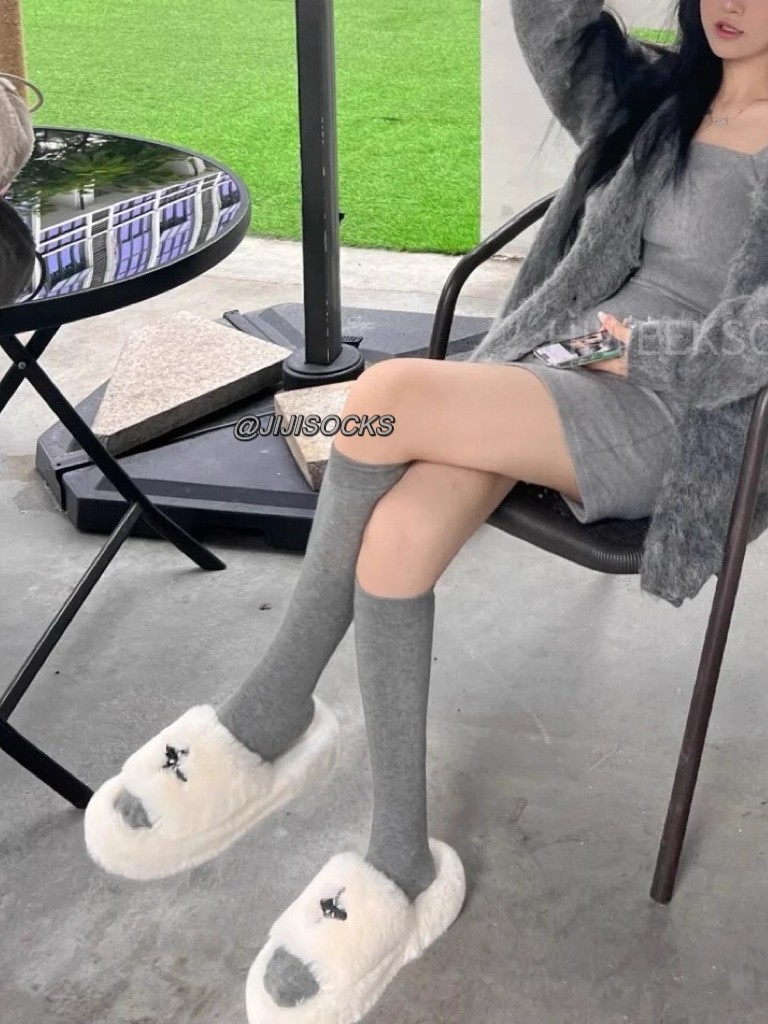 📚 春秋高级感黑灰色小腿袜女基础款百搭棉中高筒纯色显瘦及膝堆堆袜