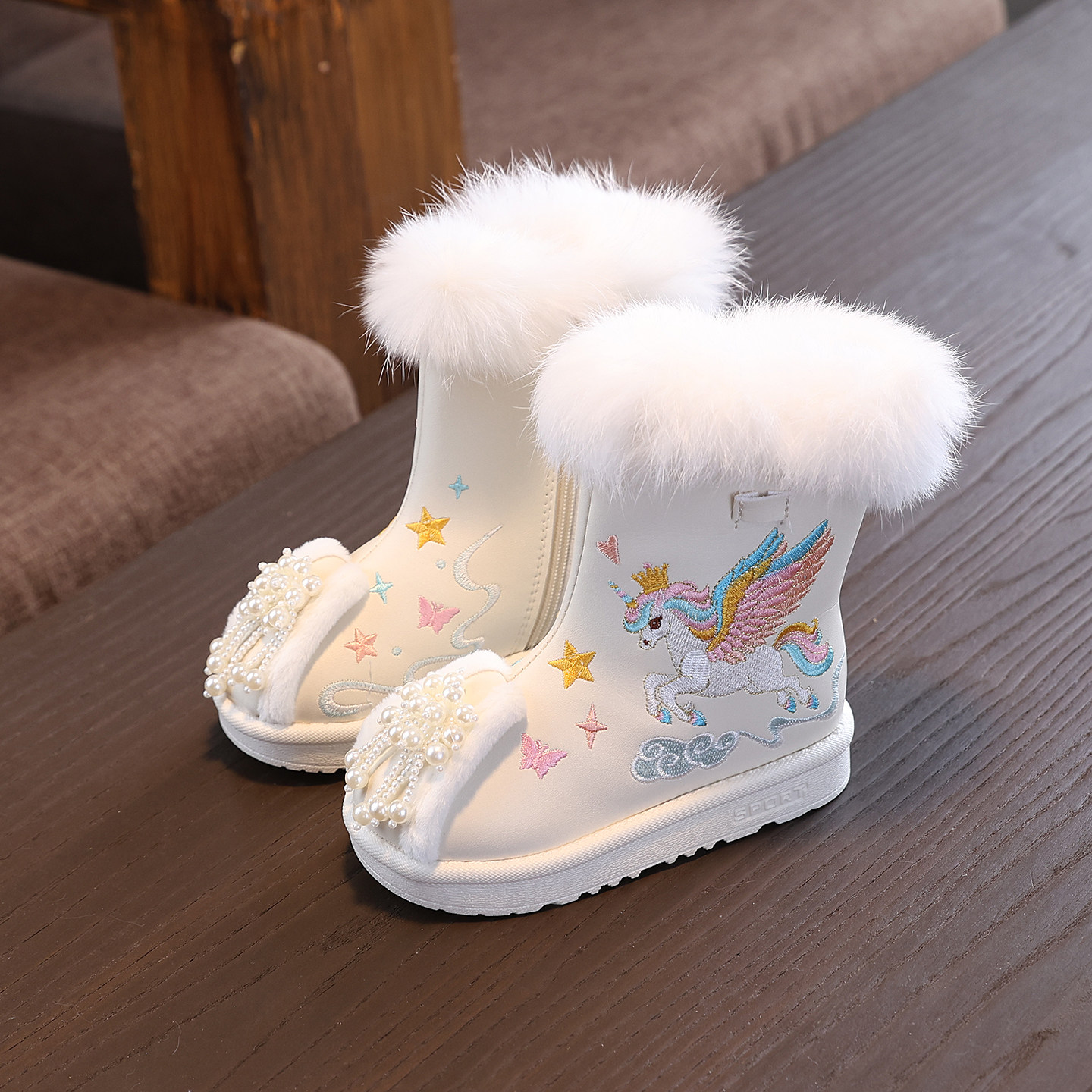📚 儿童雪地靴冬加绒中筒靴中国风汉服鞋女童加厚防水防滑大棉鞋皮靴