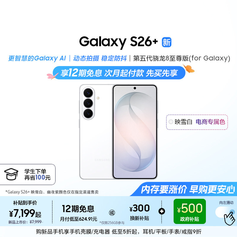 69¥ CZ225 DMVI5Rt7IIs¥ https://m.tb.cn/h.iHyjj7A 【12期免息】三星Galaxy S26+ 第五代骁龙8至尊版5000万像素超视觉影像拍照AI手机官方正品 --------------------- 【原售价】7,999元 【现售价】7,499元。