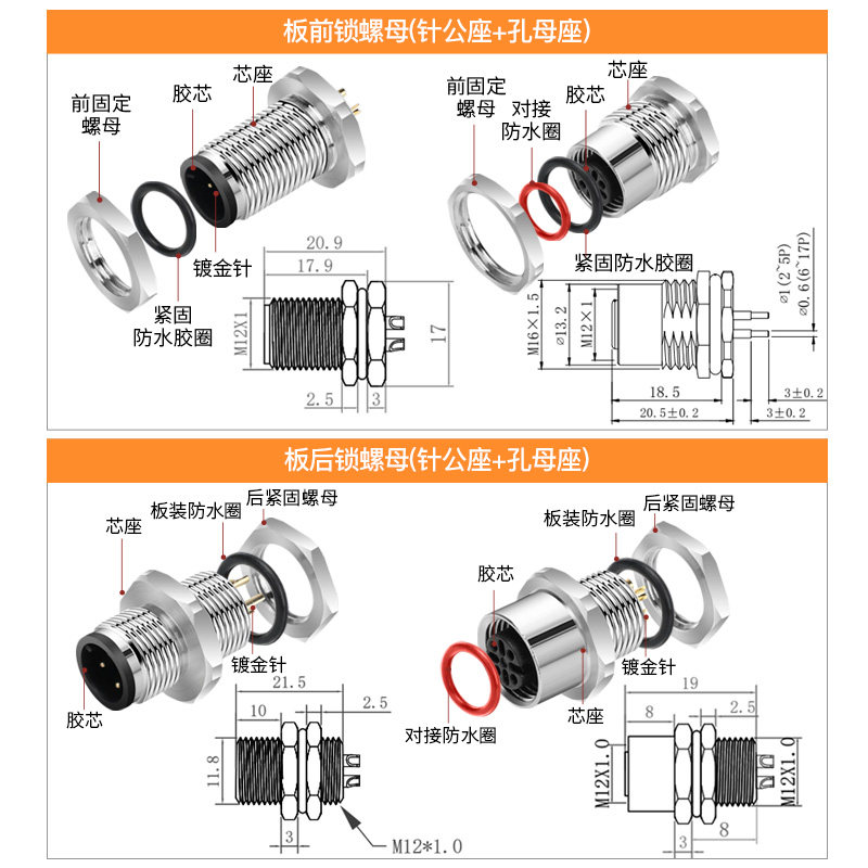 📚 M12防水连接器法兰座航空插头4芯5芯8芯灌胶一体板装固定面板插座