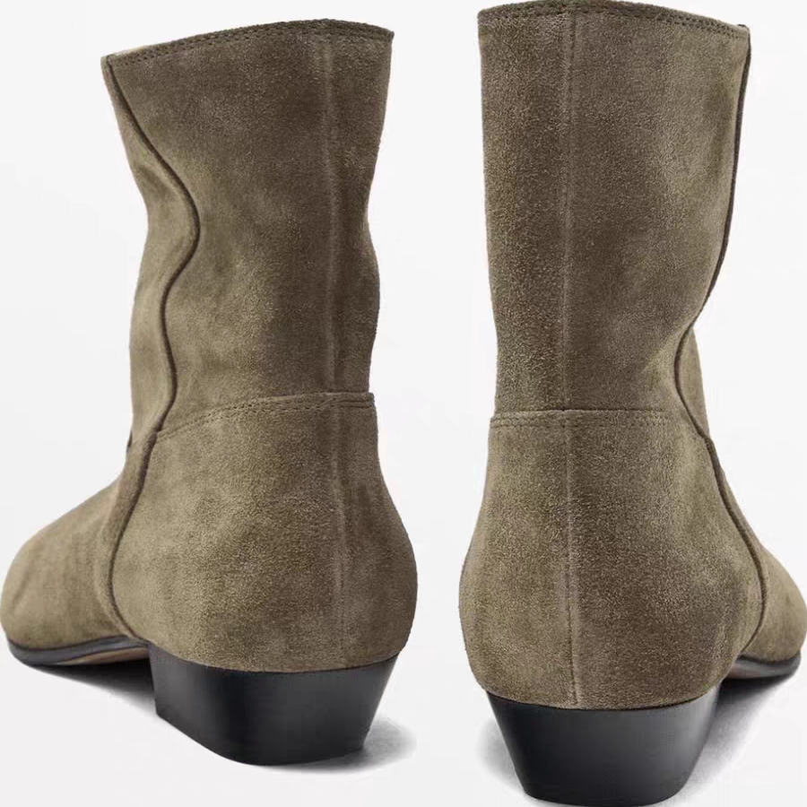 📚 西班牙MD女鞋秋冬新款真皮牛反绒短粗跟侧拉链时尚百搭短靴方头靴