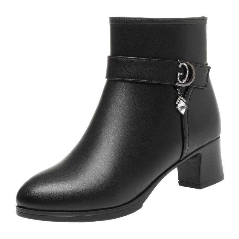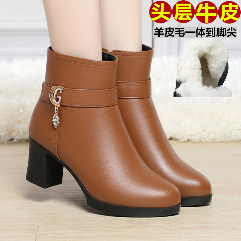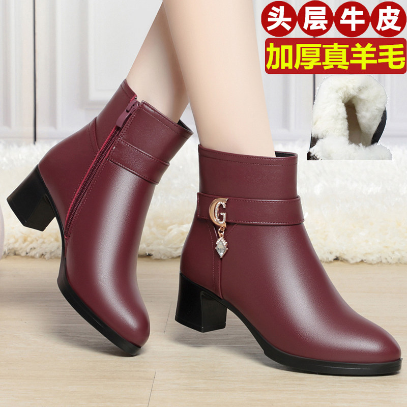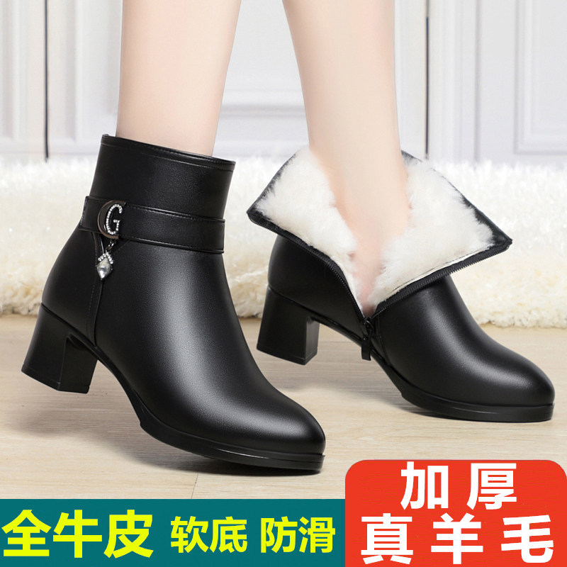 📚 秋冬季真皮女短靴单靴加绒妈妈棉鞋中高跟加厚羊毛靴粗跟中年棉靴