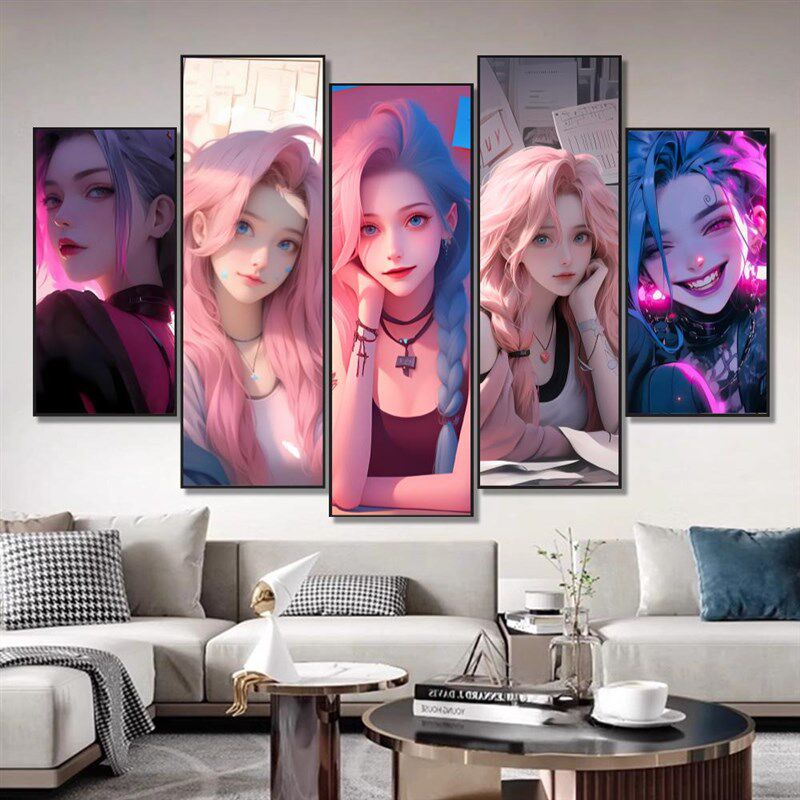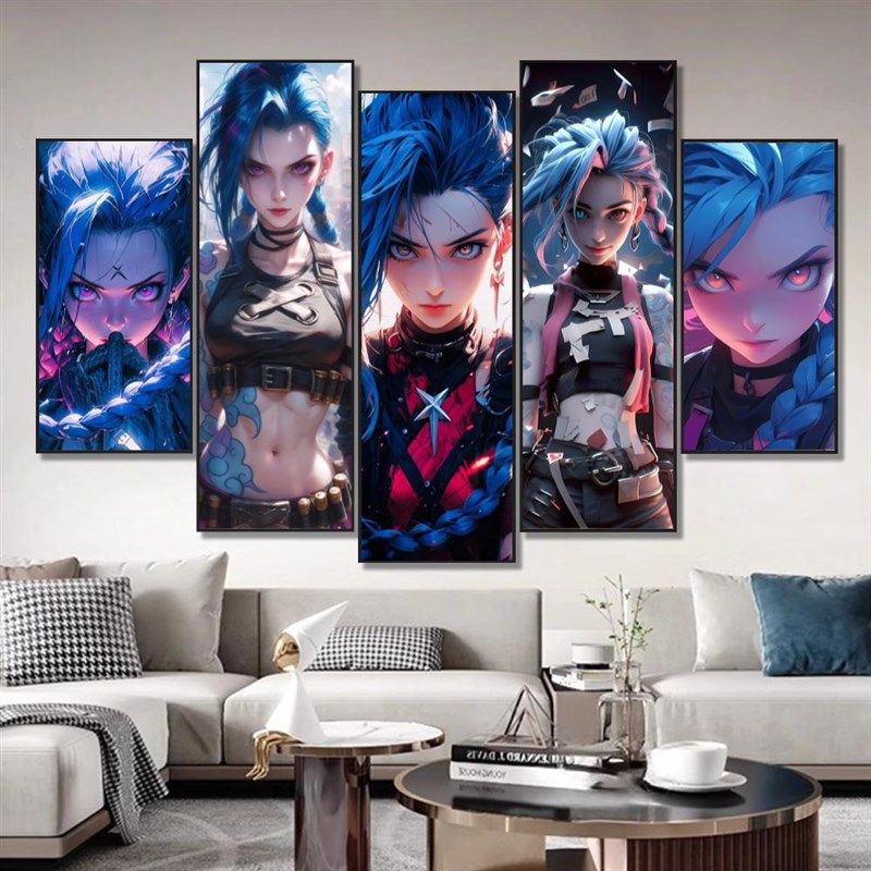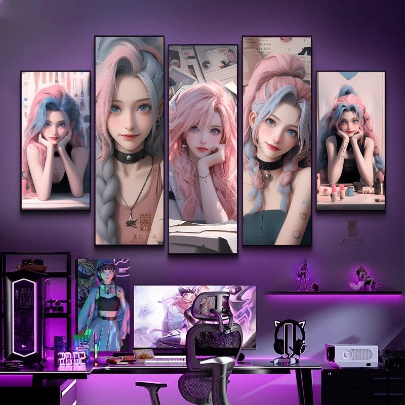 📚 英雄联盟a金克丝挂画五联客厅装饰画网咖电竞房卧室床头背景发光