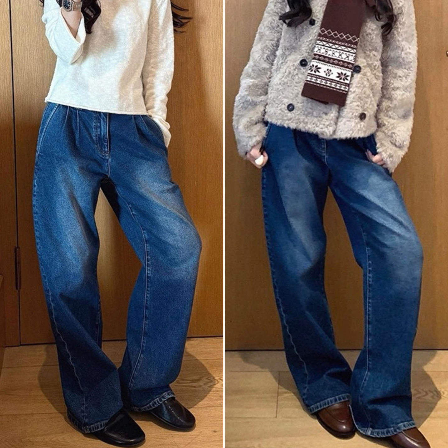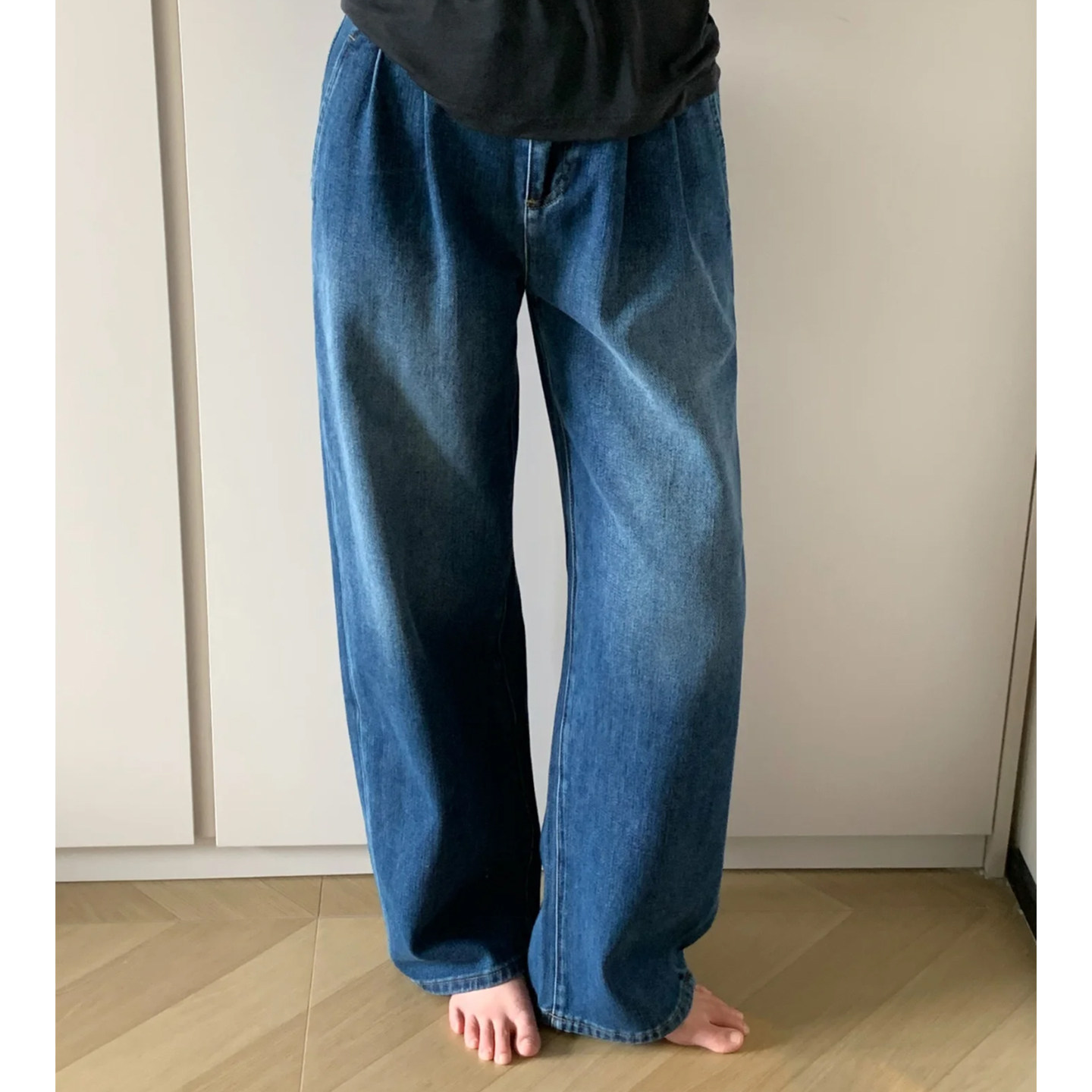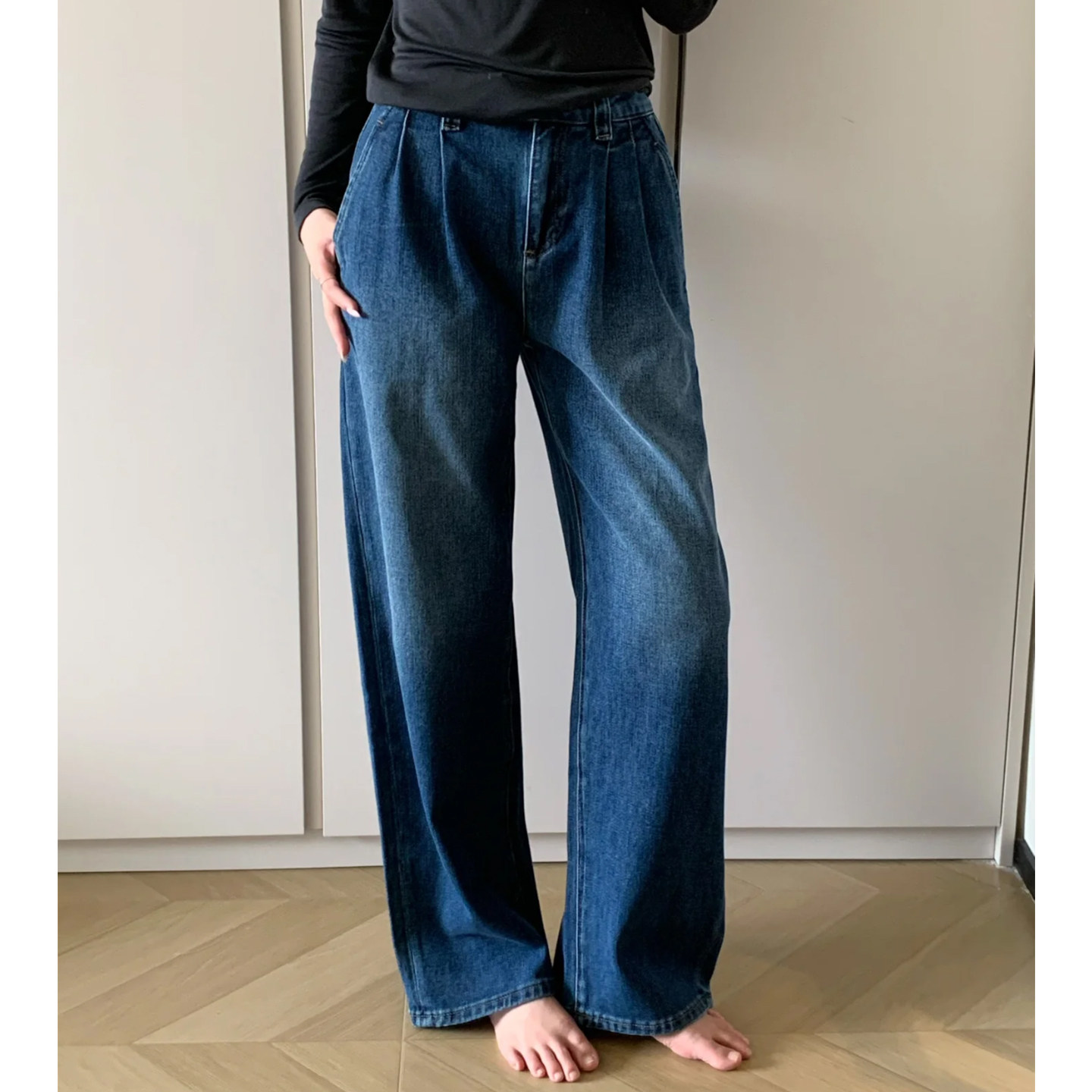 📚 梨型天菜~日本冈山酵素水洗牛仔面料 BC腰间捏褶直筒阔腿牛仔裤女