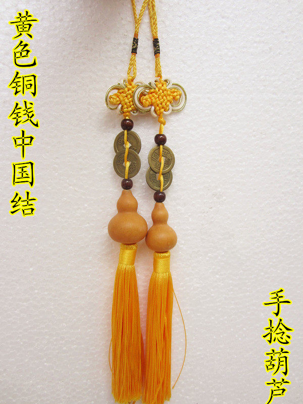 📚 天然美国手捻配铜钱小葫芦汽车包包挂饰挂件把玩配黄色中国结