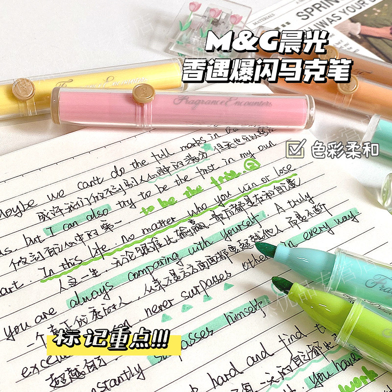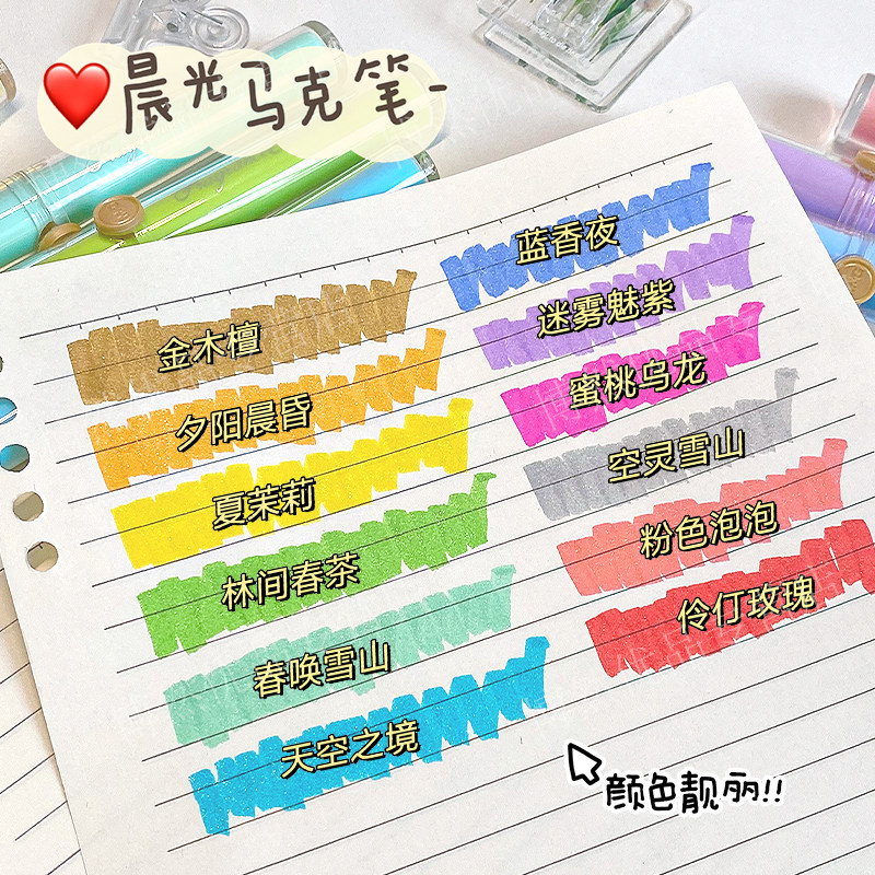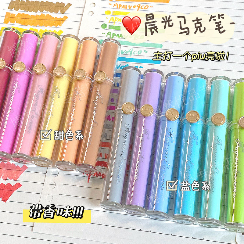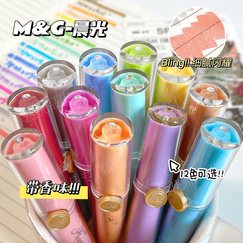 📚 晨光香遇爆闪马克笔软笔头12色荧光笔内含珠光细闪高级香味一色一香学生用闪光笔彩色划重点手帐笔APMV09C0