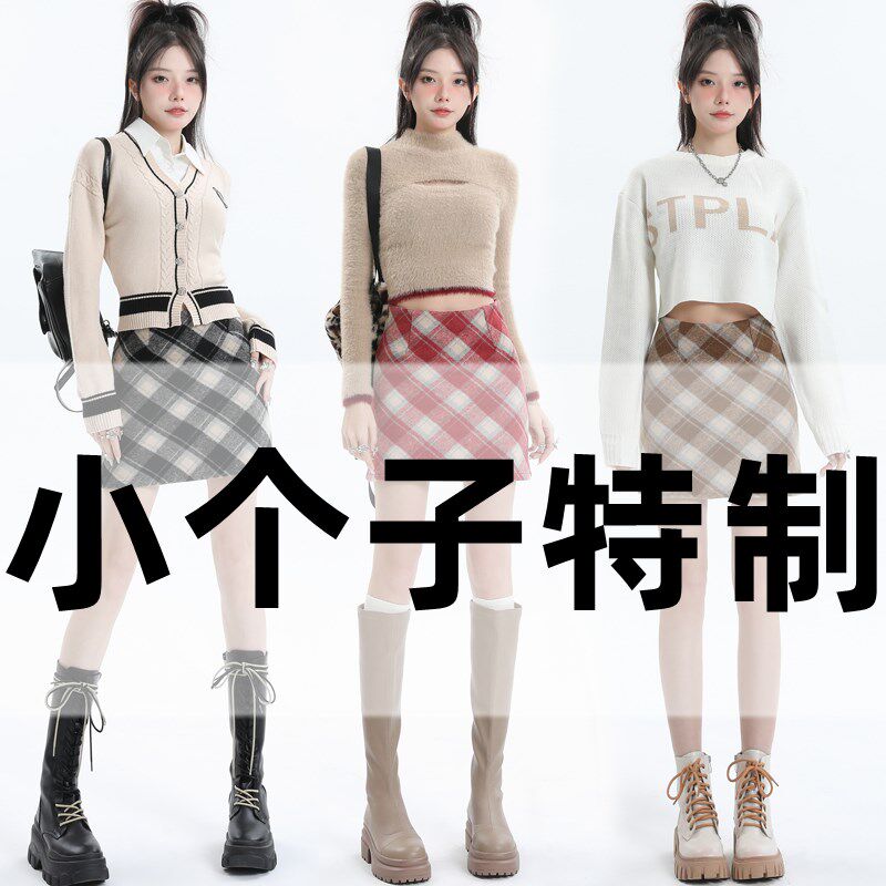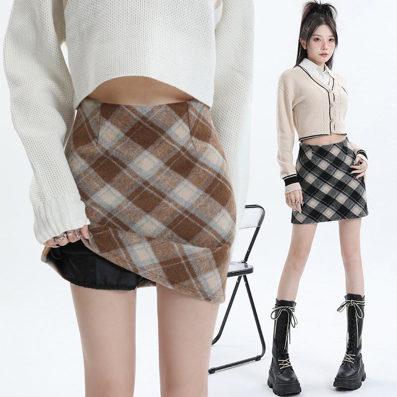 📚 红色格子毛呢半身裙女秋冬高腰包臀a字短裙子设计感bm半裙小个子