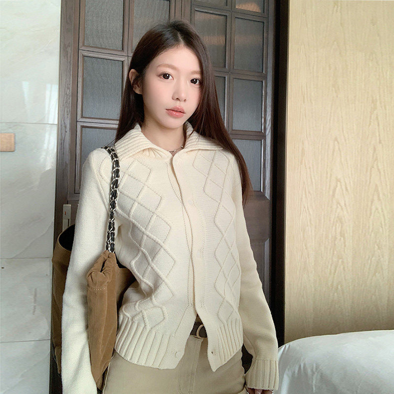 📚 2026春季奶黄色毛衣外套女菱格绞花开衫针织衫翻领正肩修身短外套