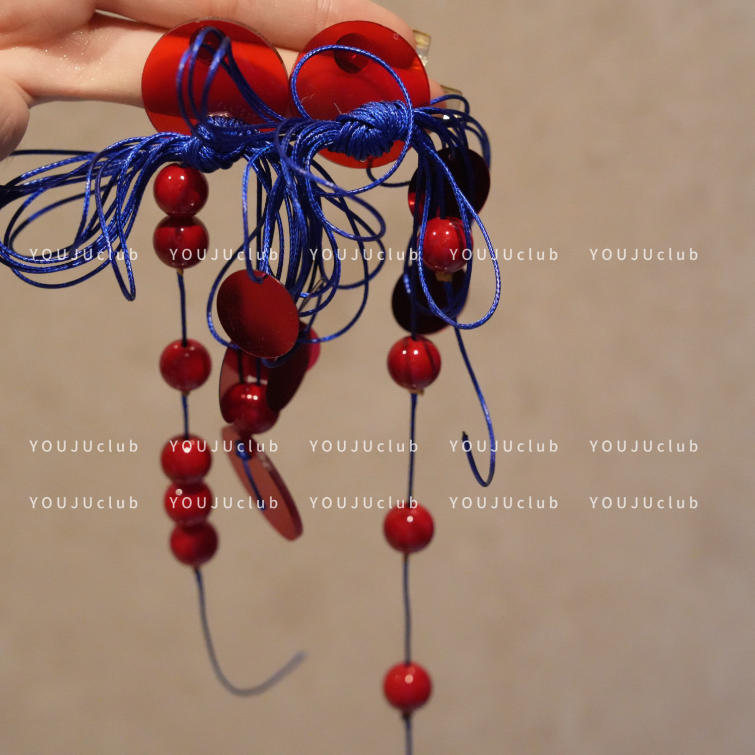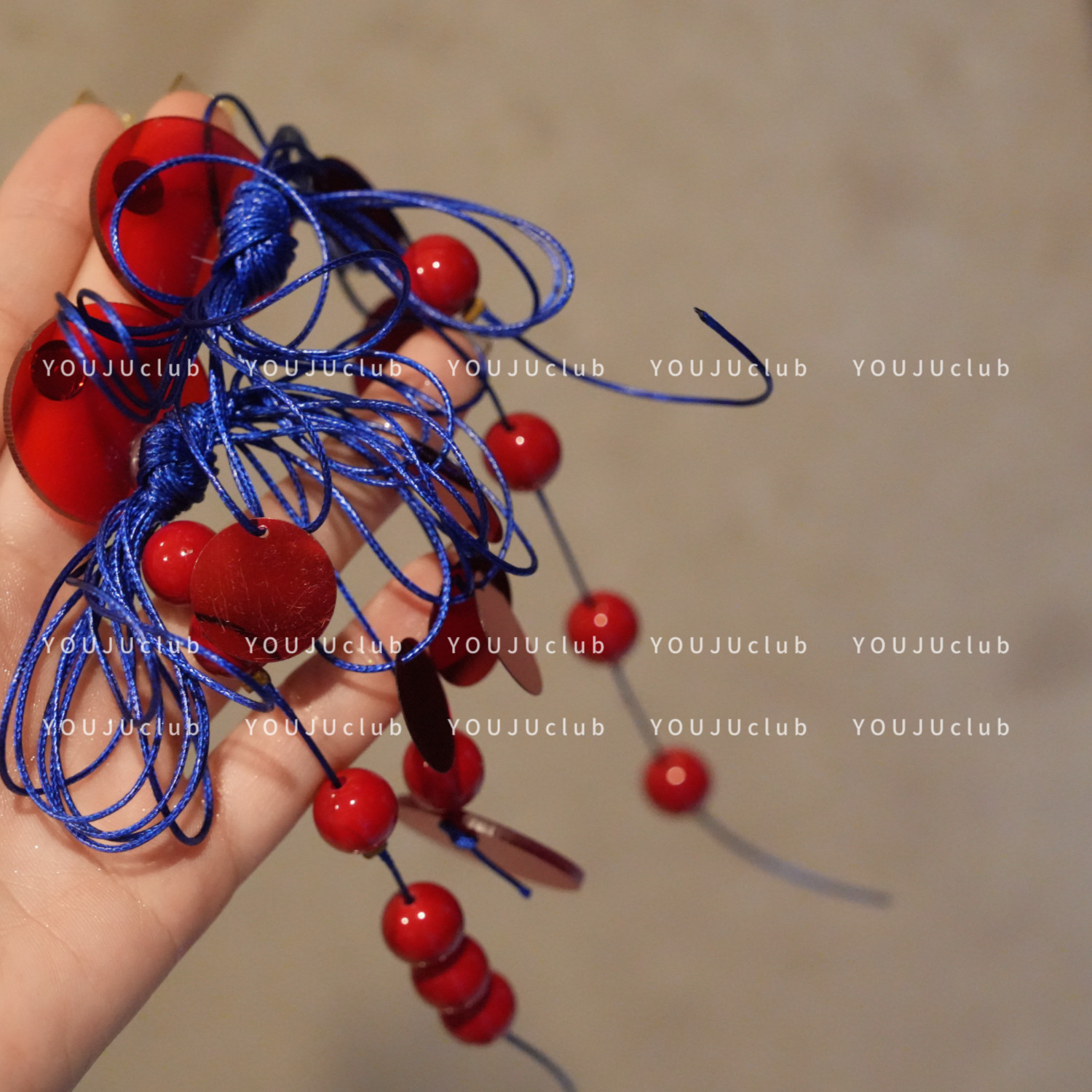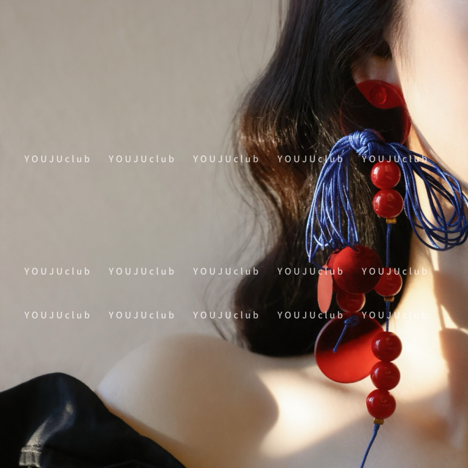 📚 YOUJUclub-永夜华章~复古夸张撞色红蓝色蝴蝶结长耳环蚊香盘耳夹