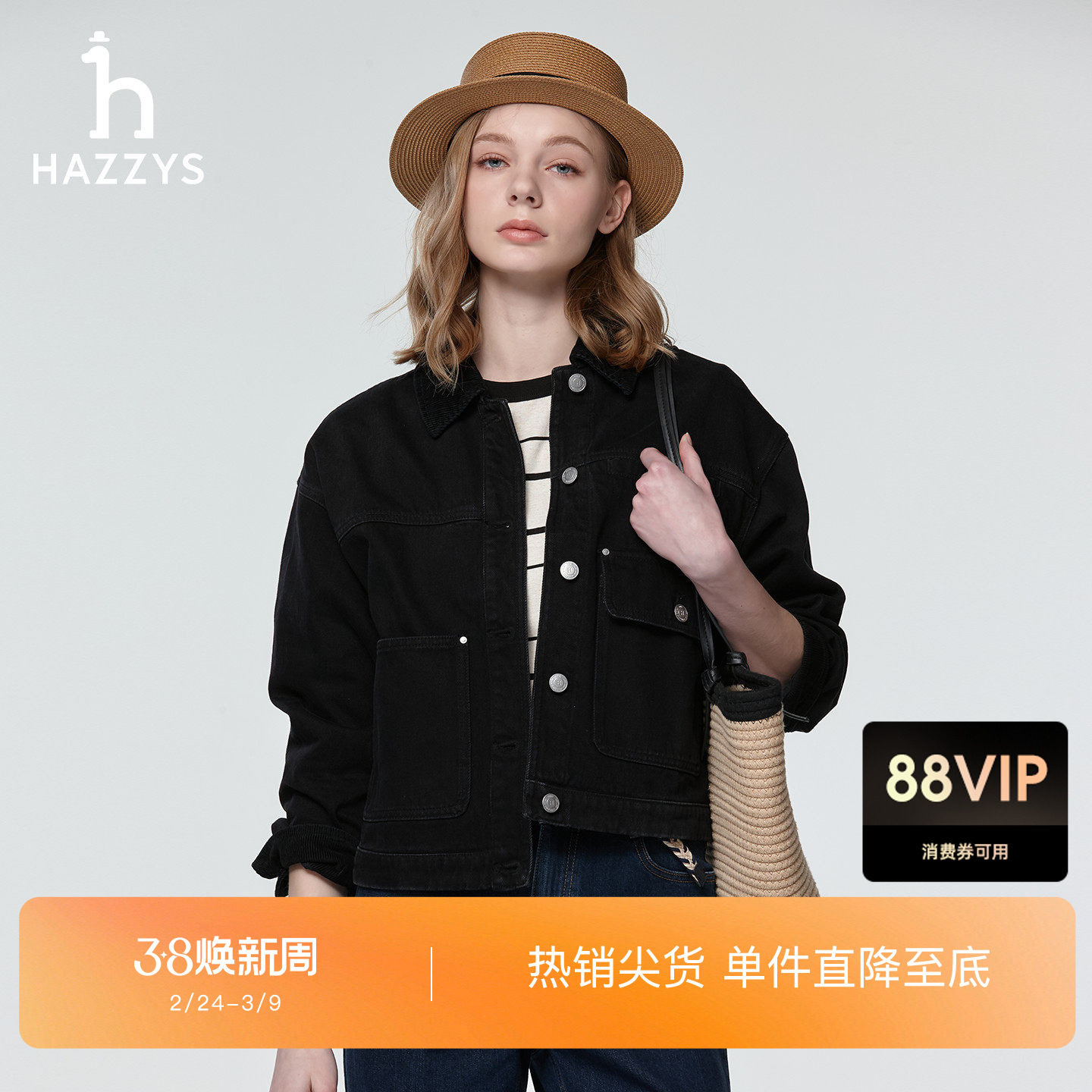 📚 Hazzys哈吉斯牛仔夹克女春季时尚潮流宽松复古灯芯绒拼接翻领外套