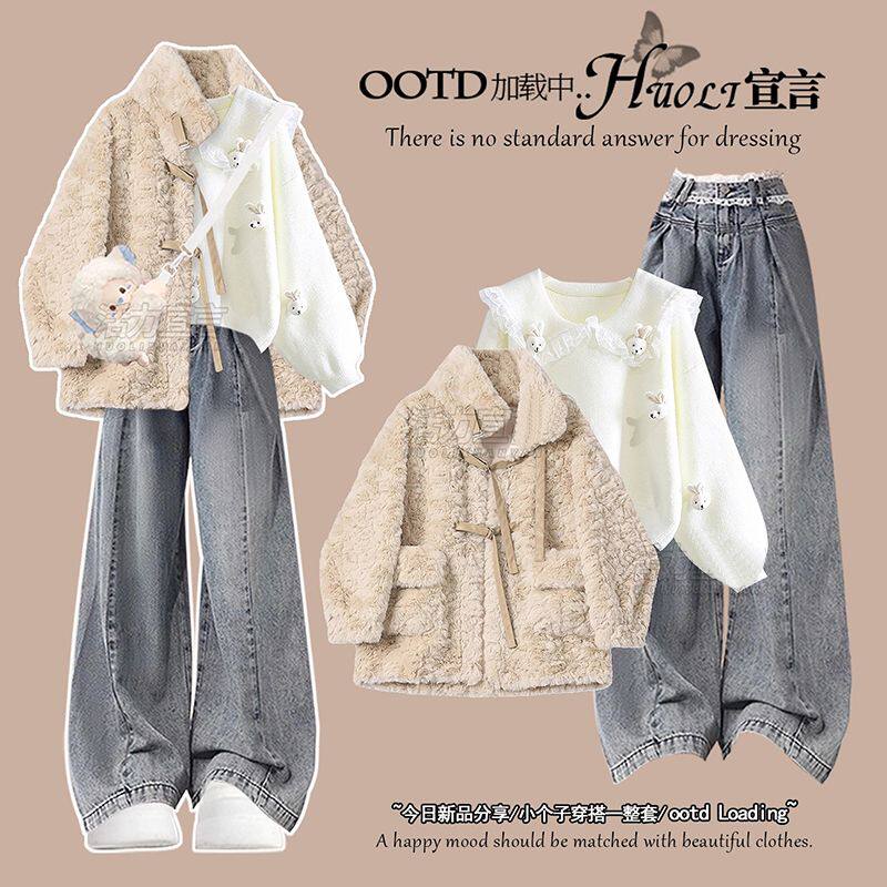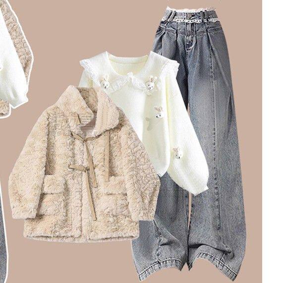 📚 成套搭配少女装羽绒棉服毛衣高中初中学生党牛仔裤三件套装女冬季