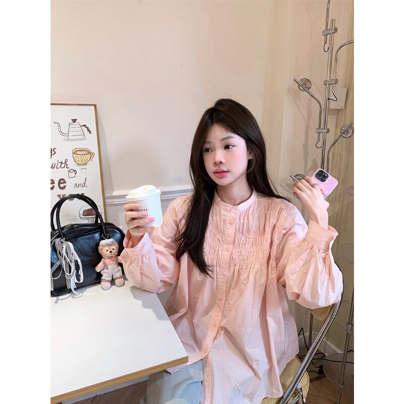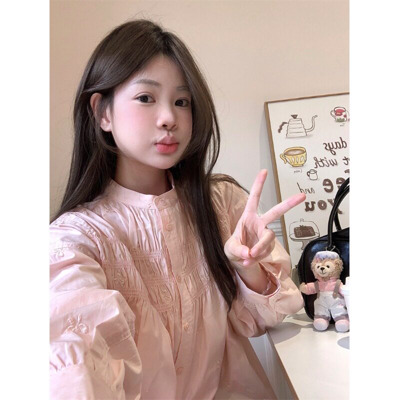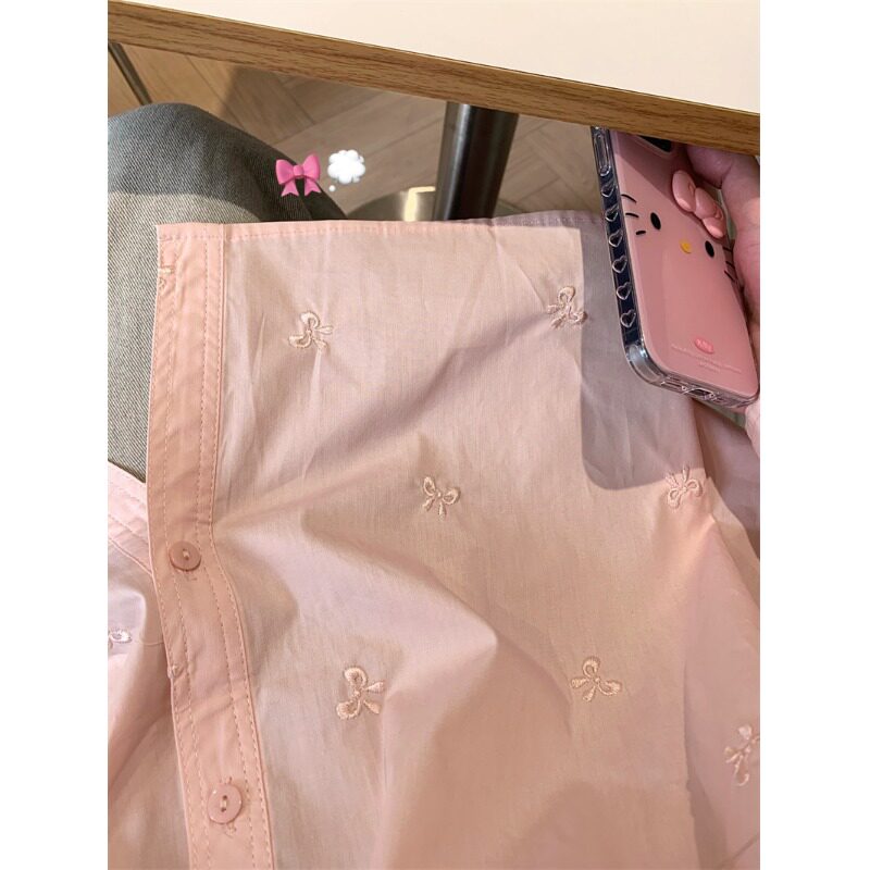 📚 粉色打揽衬衫女2026春款法式小众蝴蝶结刺绣衬衣宽松韩系甜美上衣