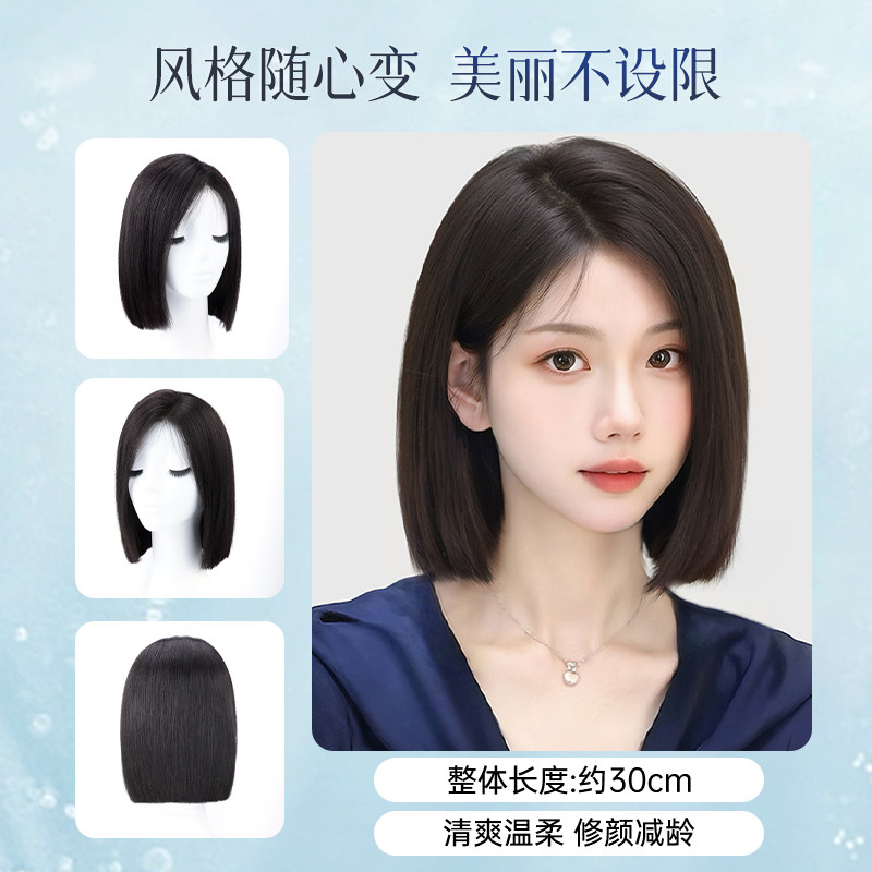 📚 短发假发女真发全头无痕蓬松自然蕾丝偏分一刀切真人发丝假发套