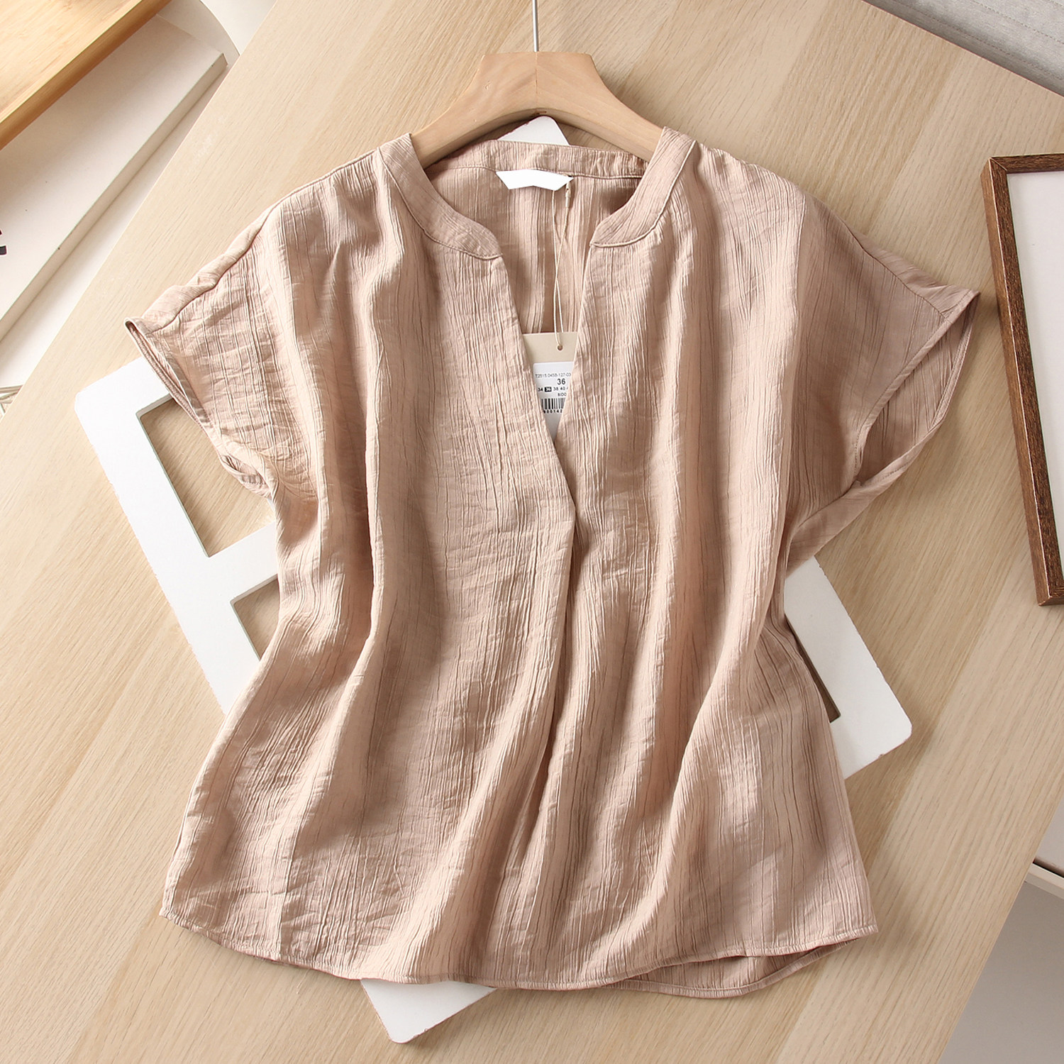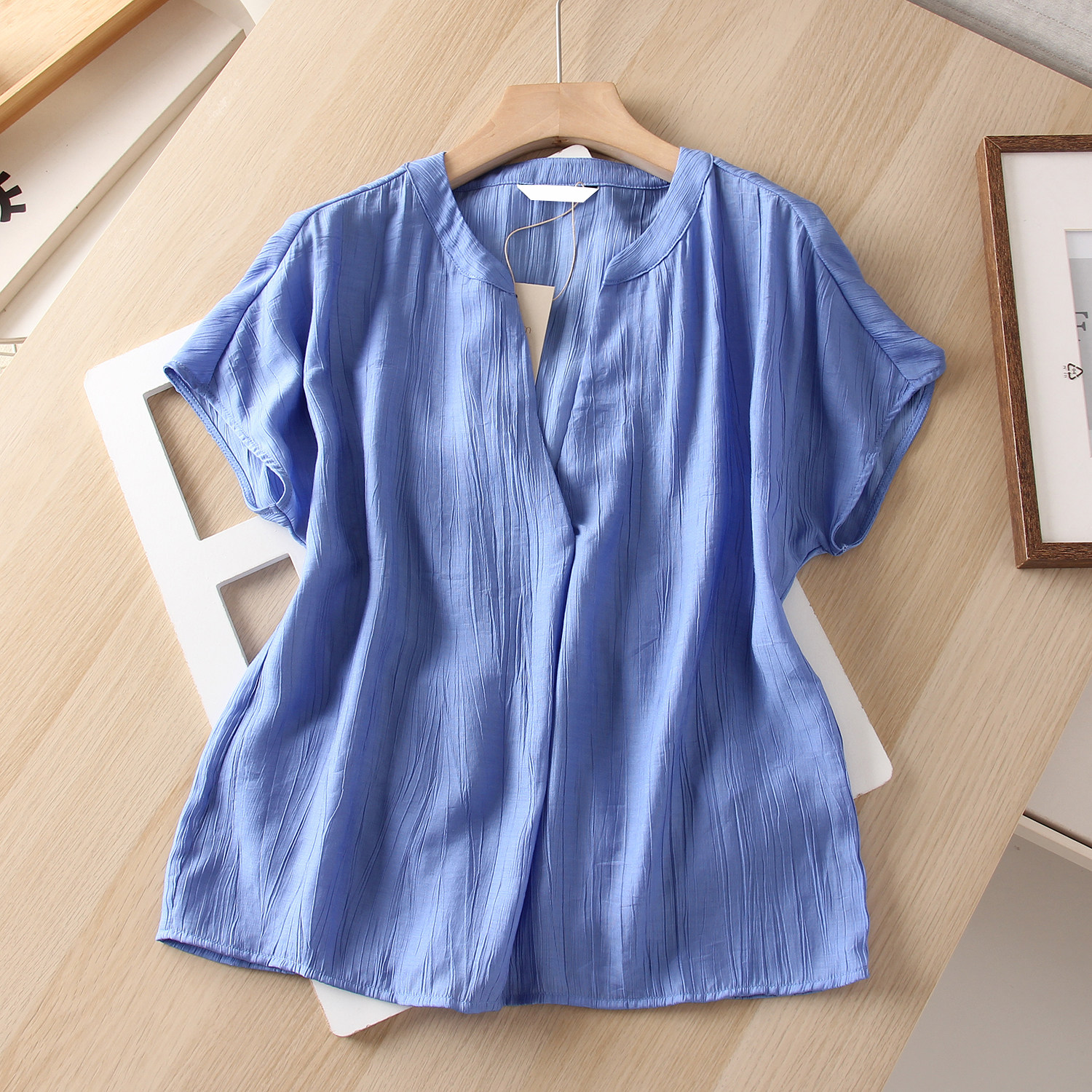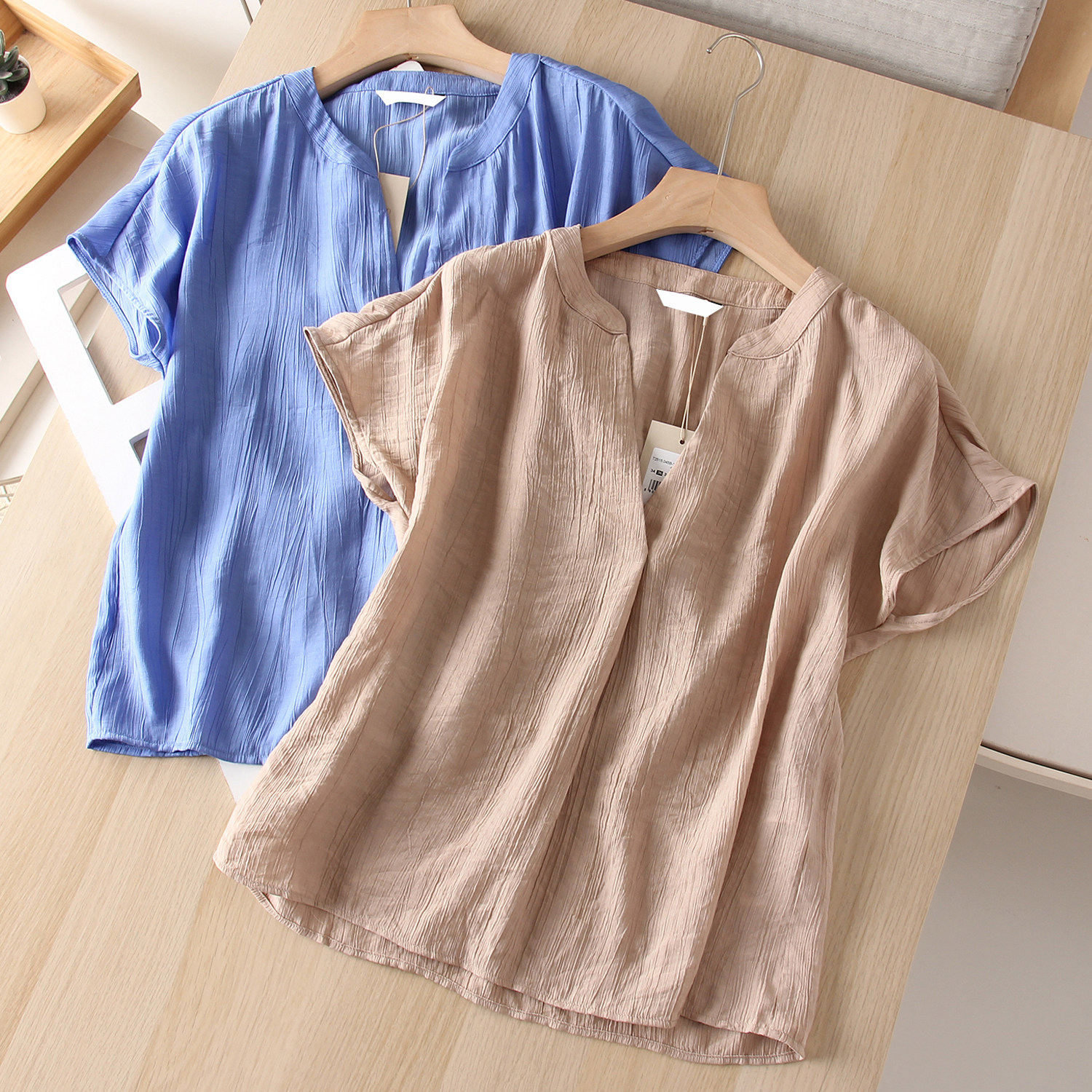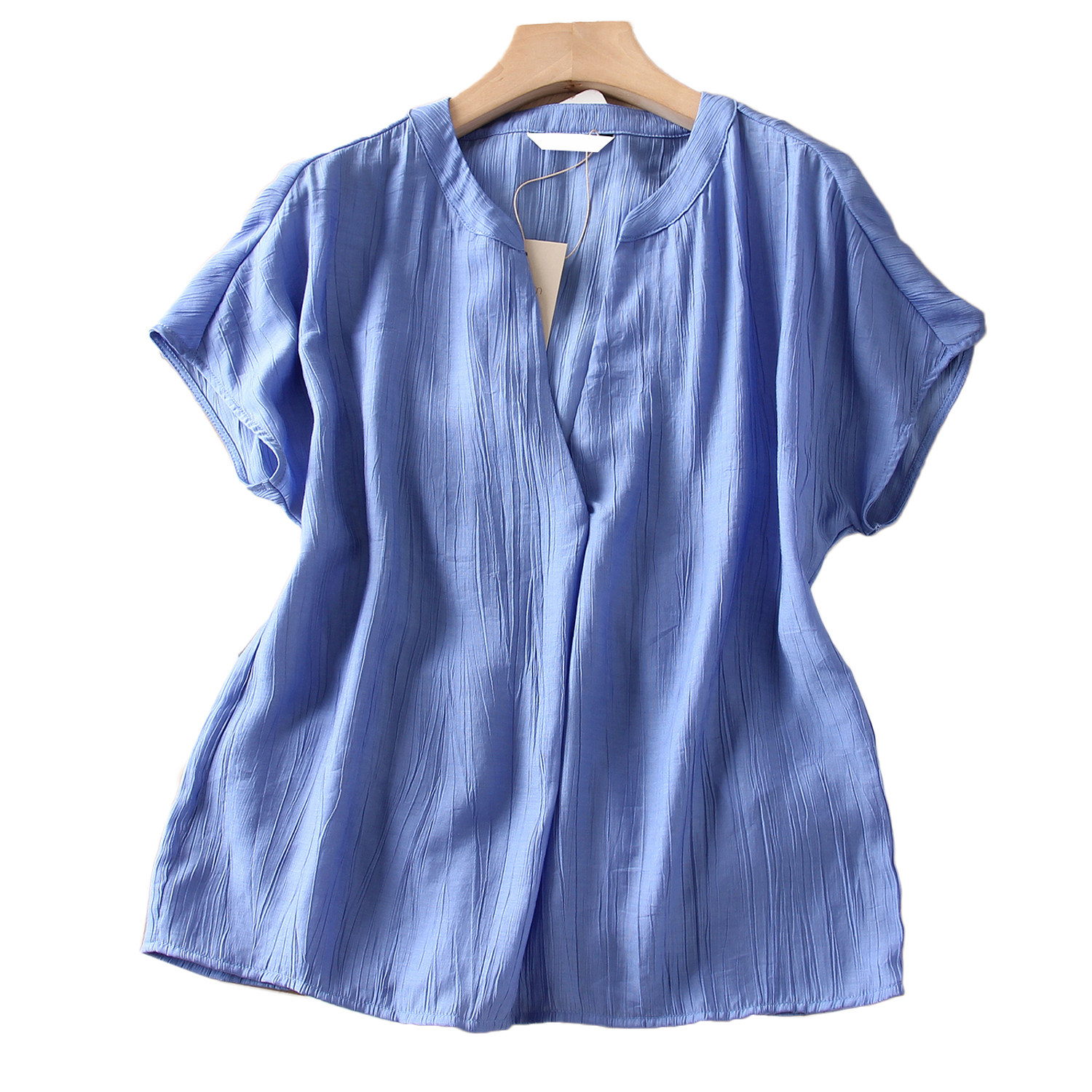 📚 简约时尚 轻薄透气褶皱肌理 V小立领宽松连身短袖套头 女衬衫衬衣