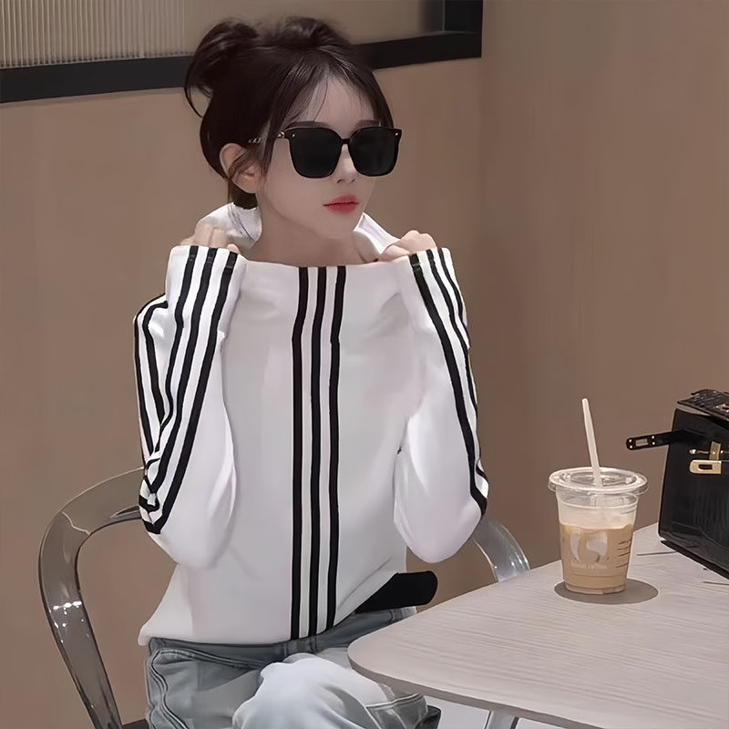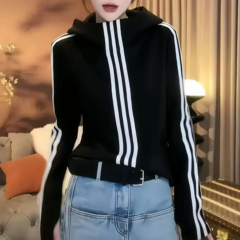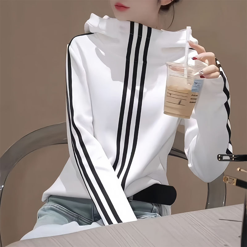 📚 2025春秋新款连帽打底衫女韩版三条杠条纹长袖休闲百搭显瘦上衣女