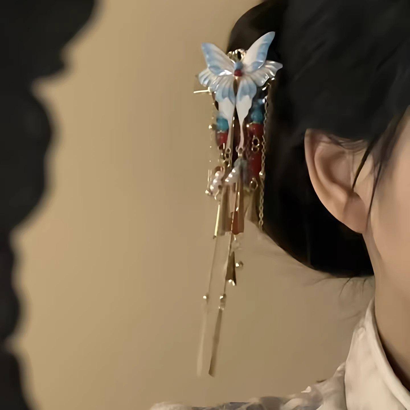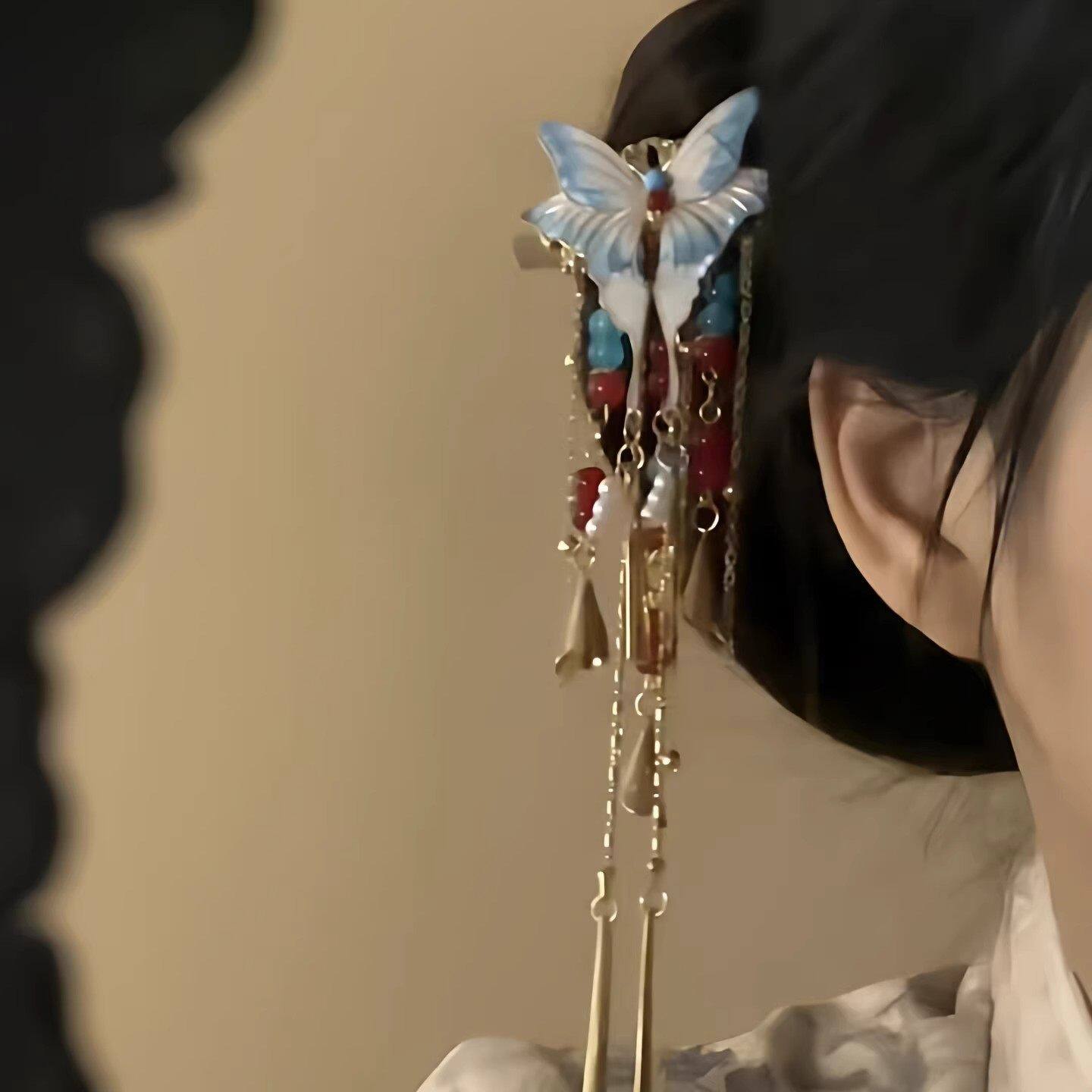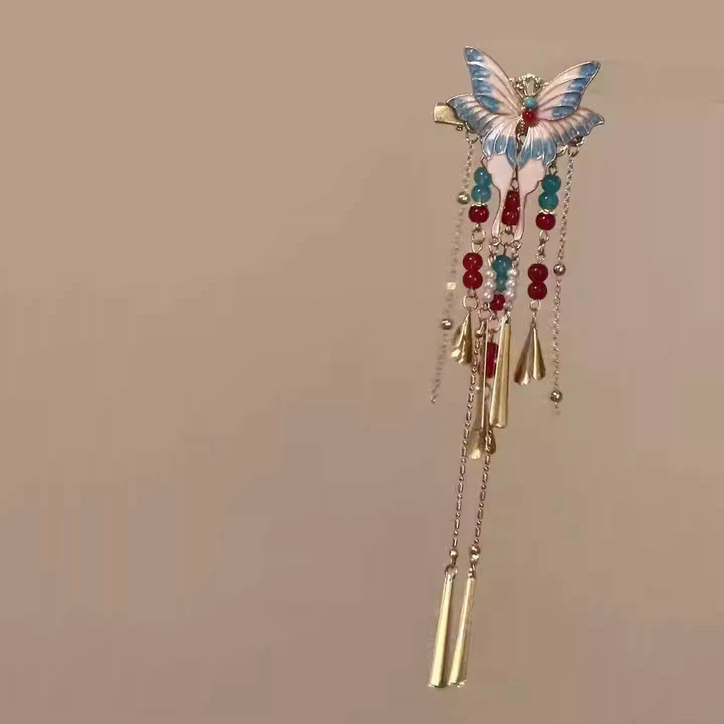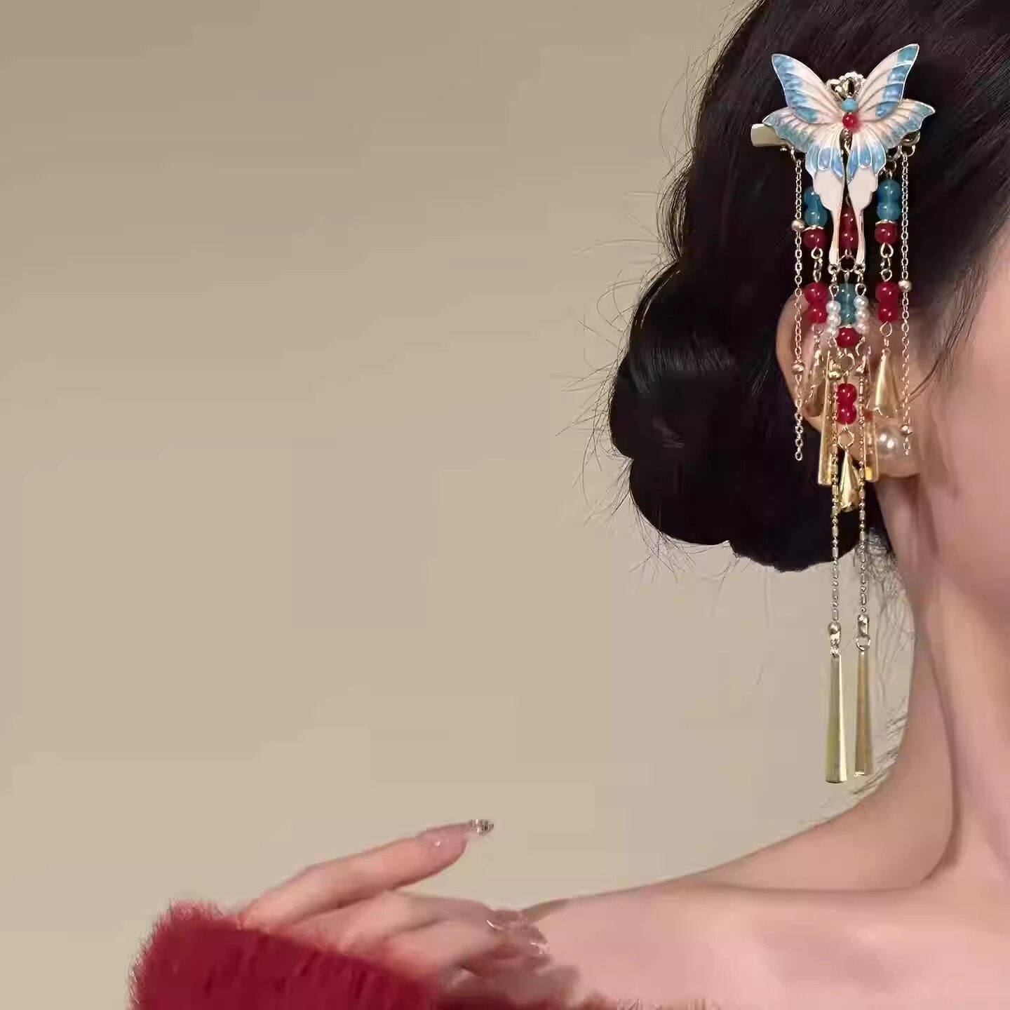 📚 新中式红蓝撞色蝴蝶流苏发夹国风精致优雅配汉服发饰