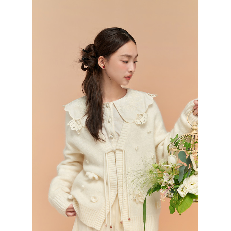 📚 紫涵V领盘扣羊毛针织开衫女冬季新款手工钩花宽松休闲毛衣短外套