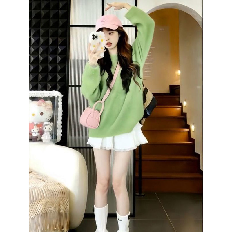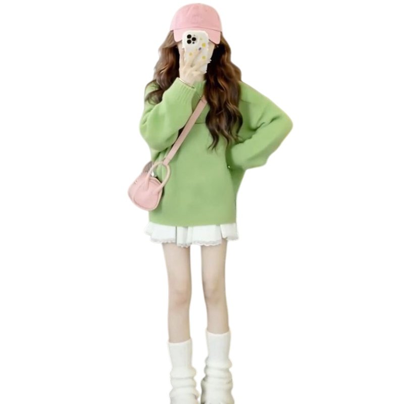 📚 新款高饱和度小清新绿色长袖针织毛衣衫搭配百搭白色短裙两件套装