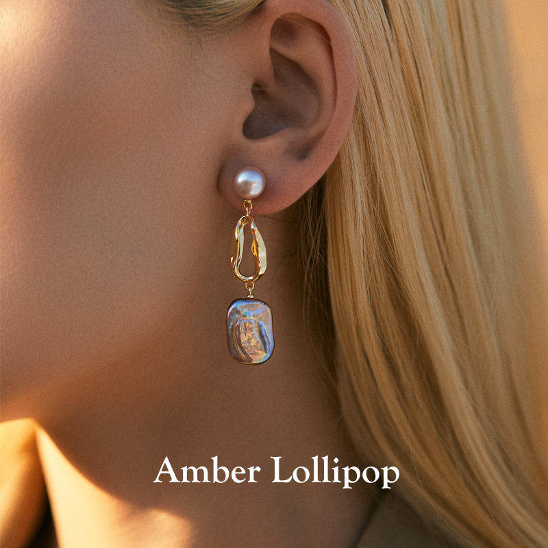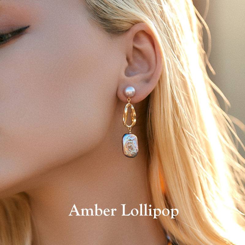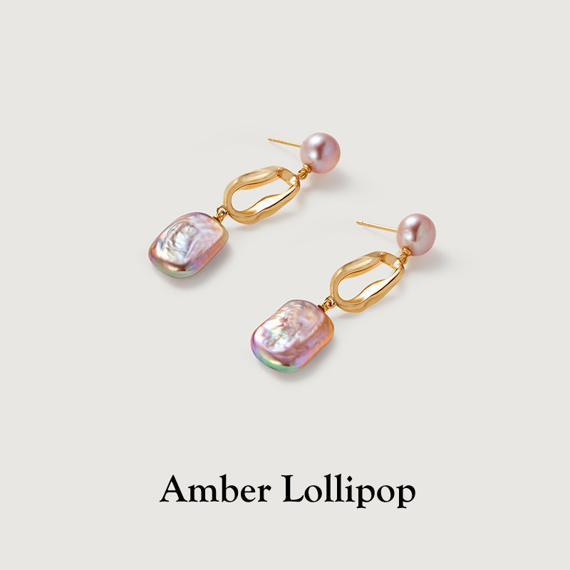 📚 Amber Lollipop巴洛克珍珠耳环女淡紫色方糖耳钉独特s925银针耳饰