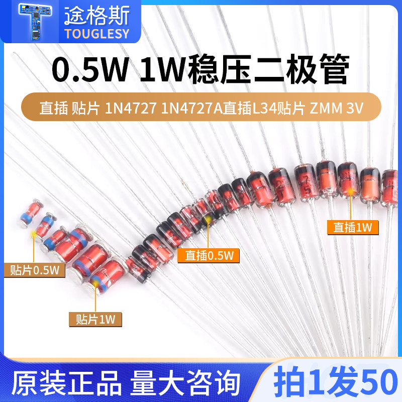 📚 0.5W 1/2W稳压管1W二极管1N4727 1N4727A直插L34贴片ZMM 3V 50只