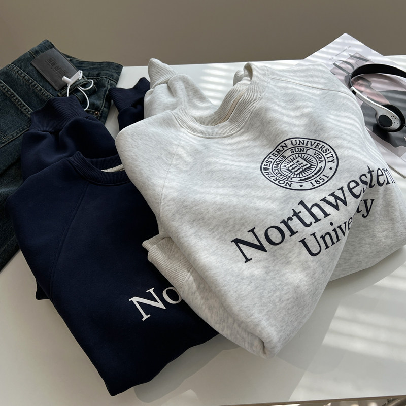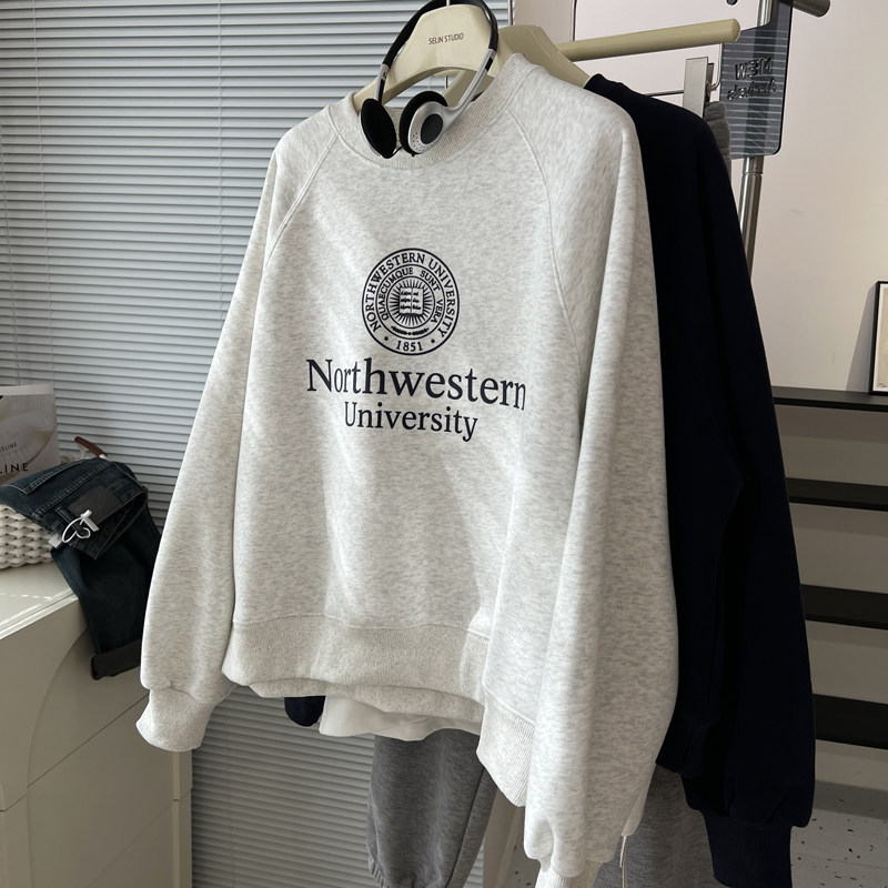 📚 韩风chic复古时髦字母圆领套头卫衣女加绒加厚宽松慵懒风外套冬季