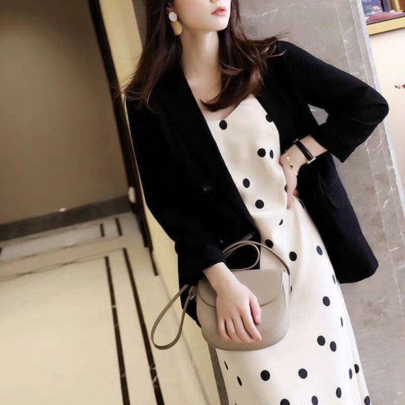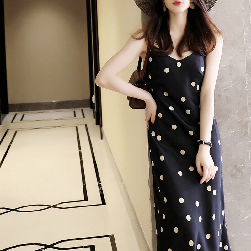 📚 2025夏季日系轻奢缎面吊带连衣裙女中长款显瘦V领波点内搭裙子