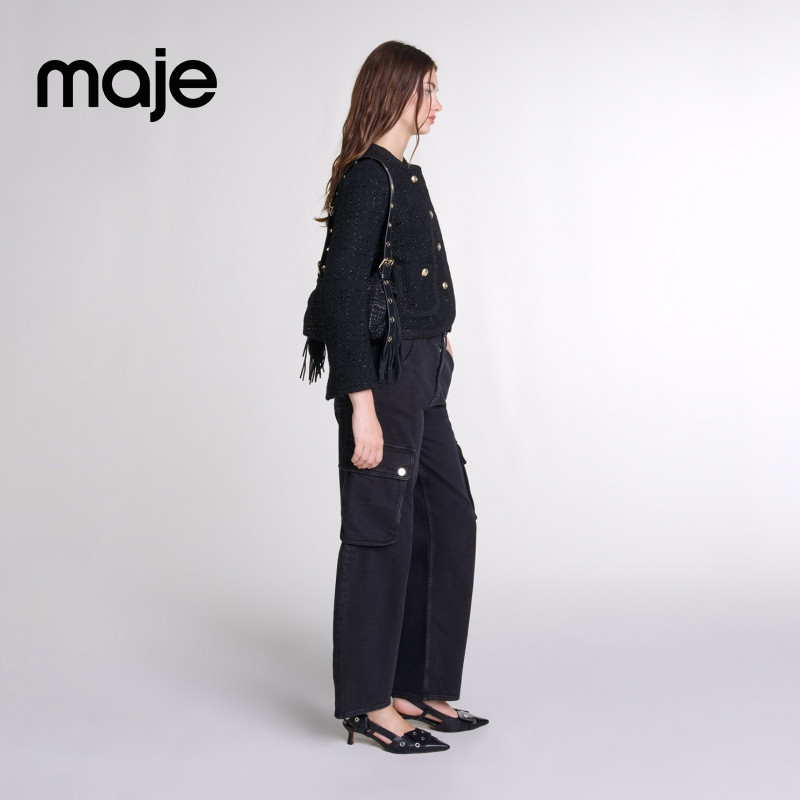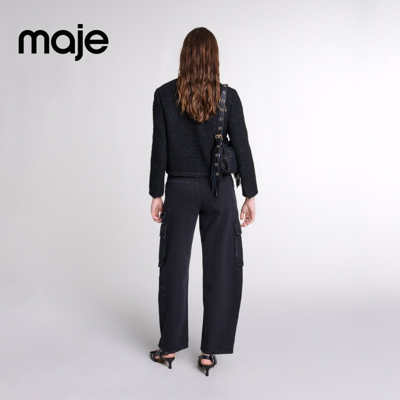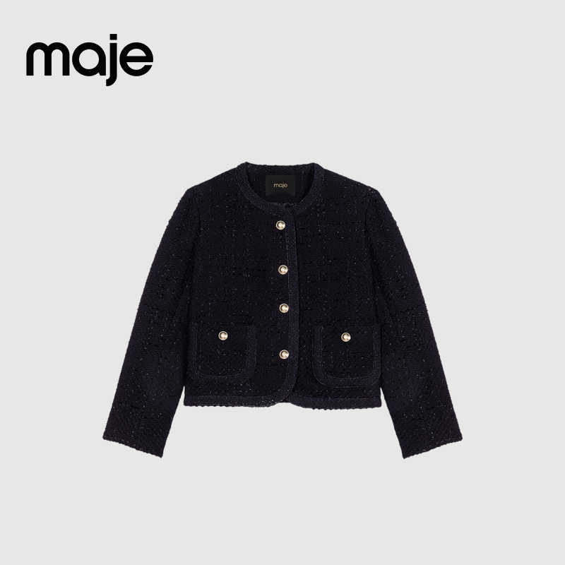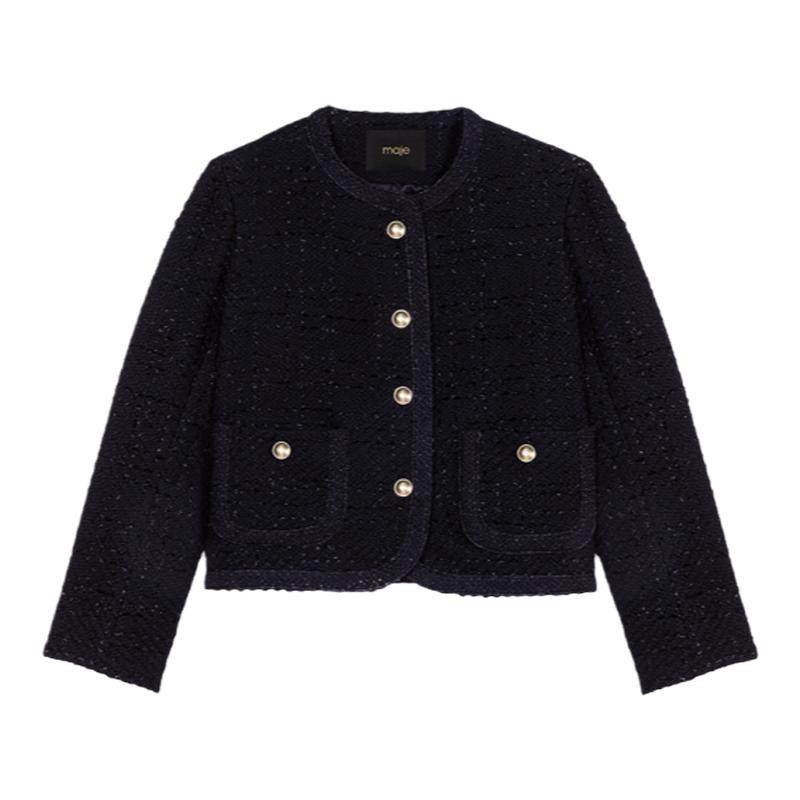 📚 Maje春夏女装法式时尚闪亮粗花呢单排扣双口袋圆领短款长袖外套