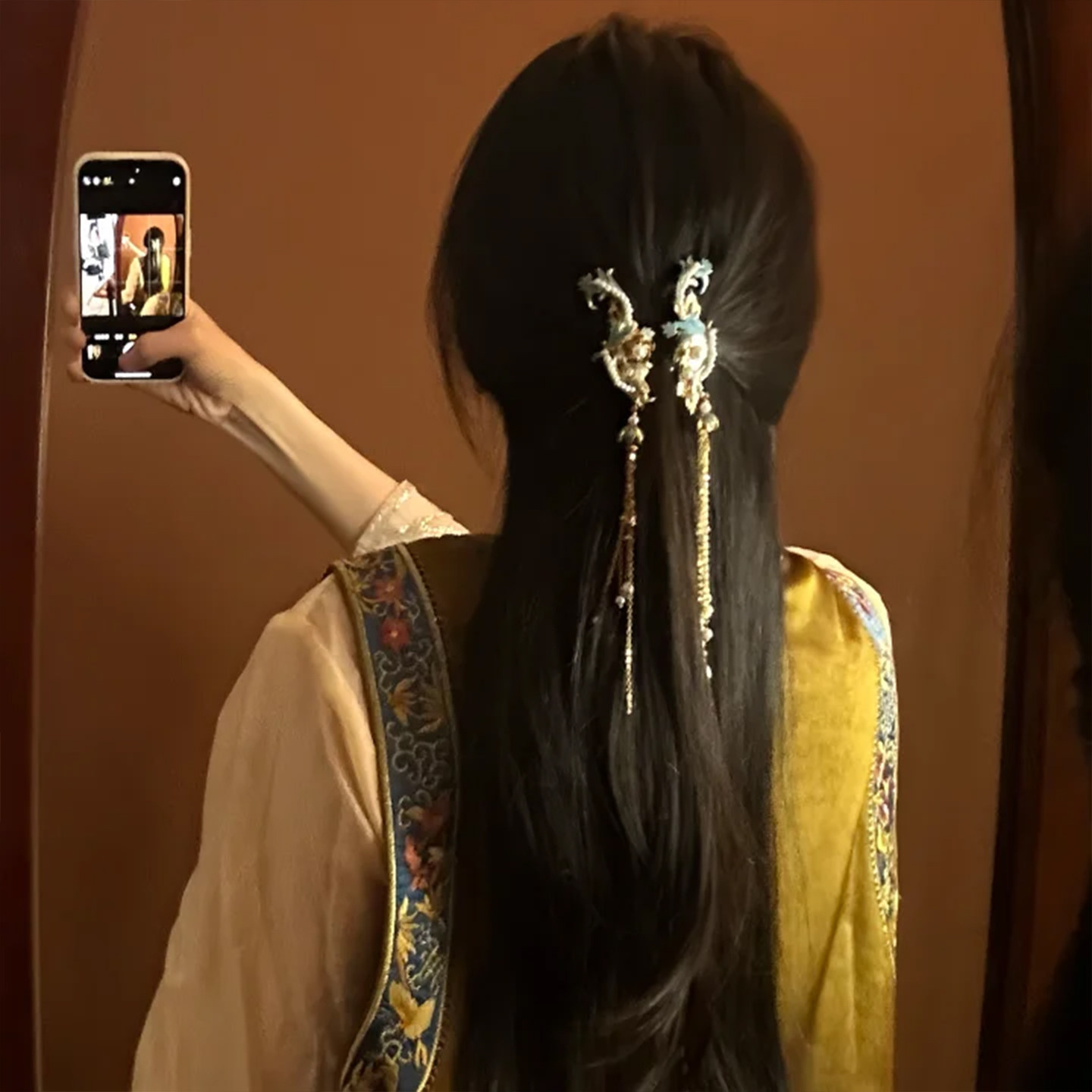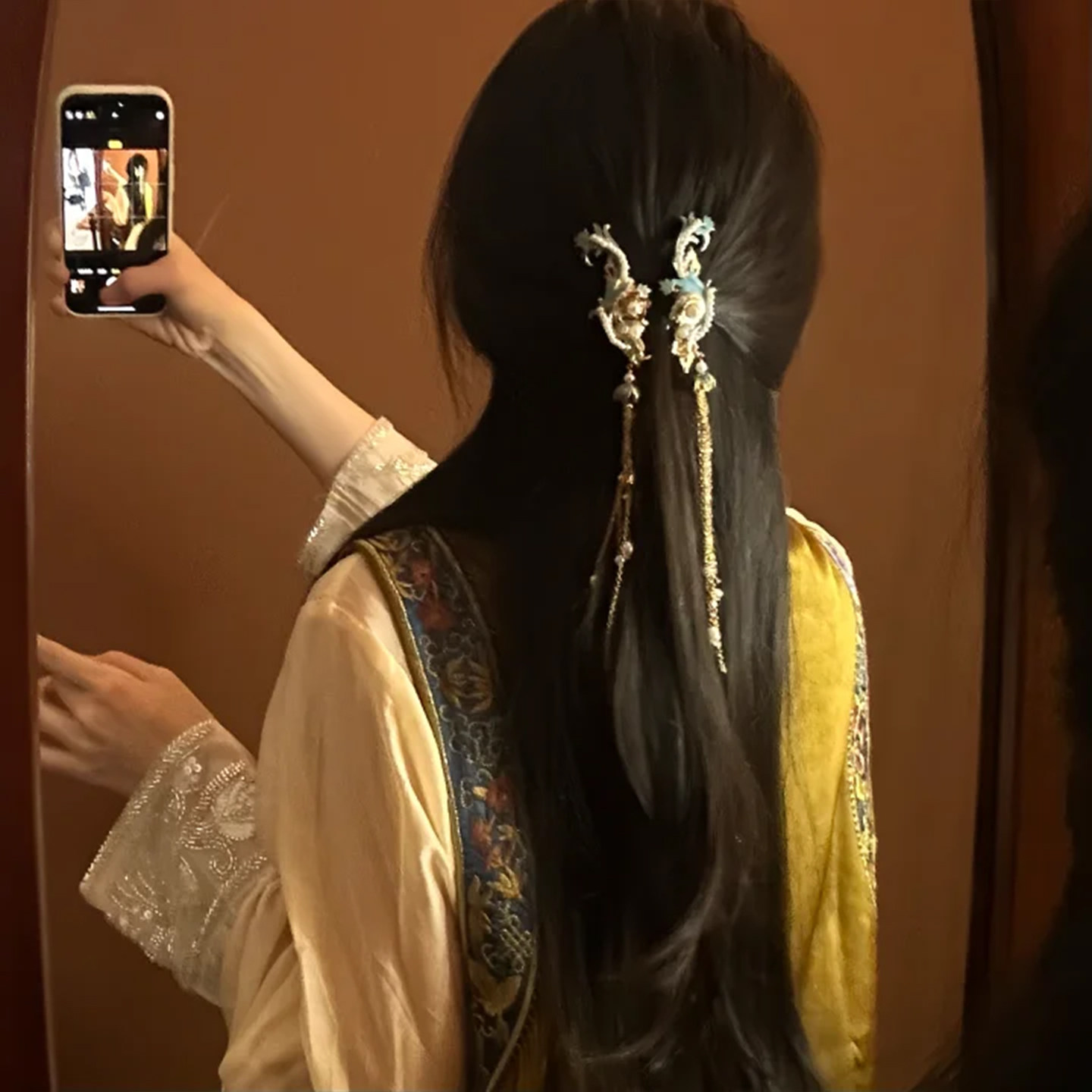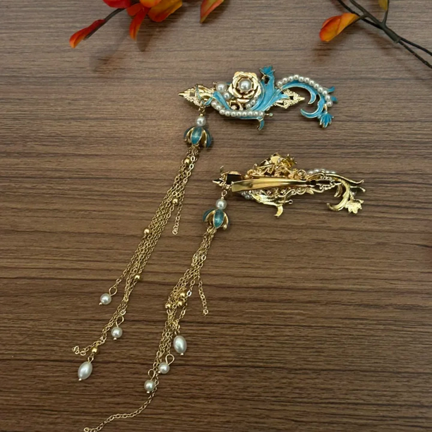 📚 山沐手作「海棠花开」国风蓝色花朵发夹女流苏头饰侧边夹古风发饰